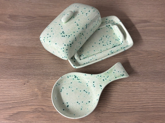 Butter Dish, Sugar Bowl, Milk Jug Set Speckled Green Glaze