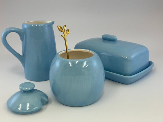 Butter Dish, Sugar Bowl, Milk Jug Set Sky Blue Glaze