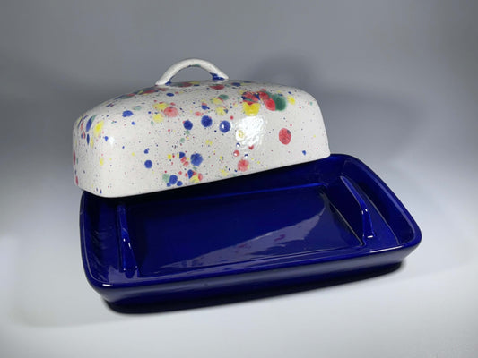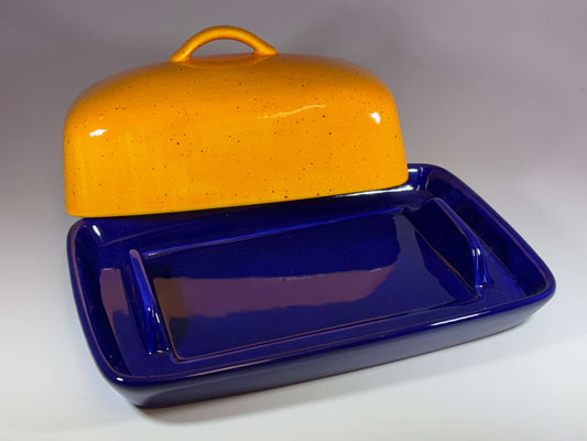 Royal Blue Butter Dish with Yellow Lid and Handle