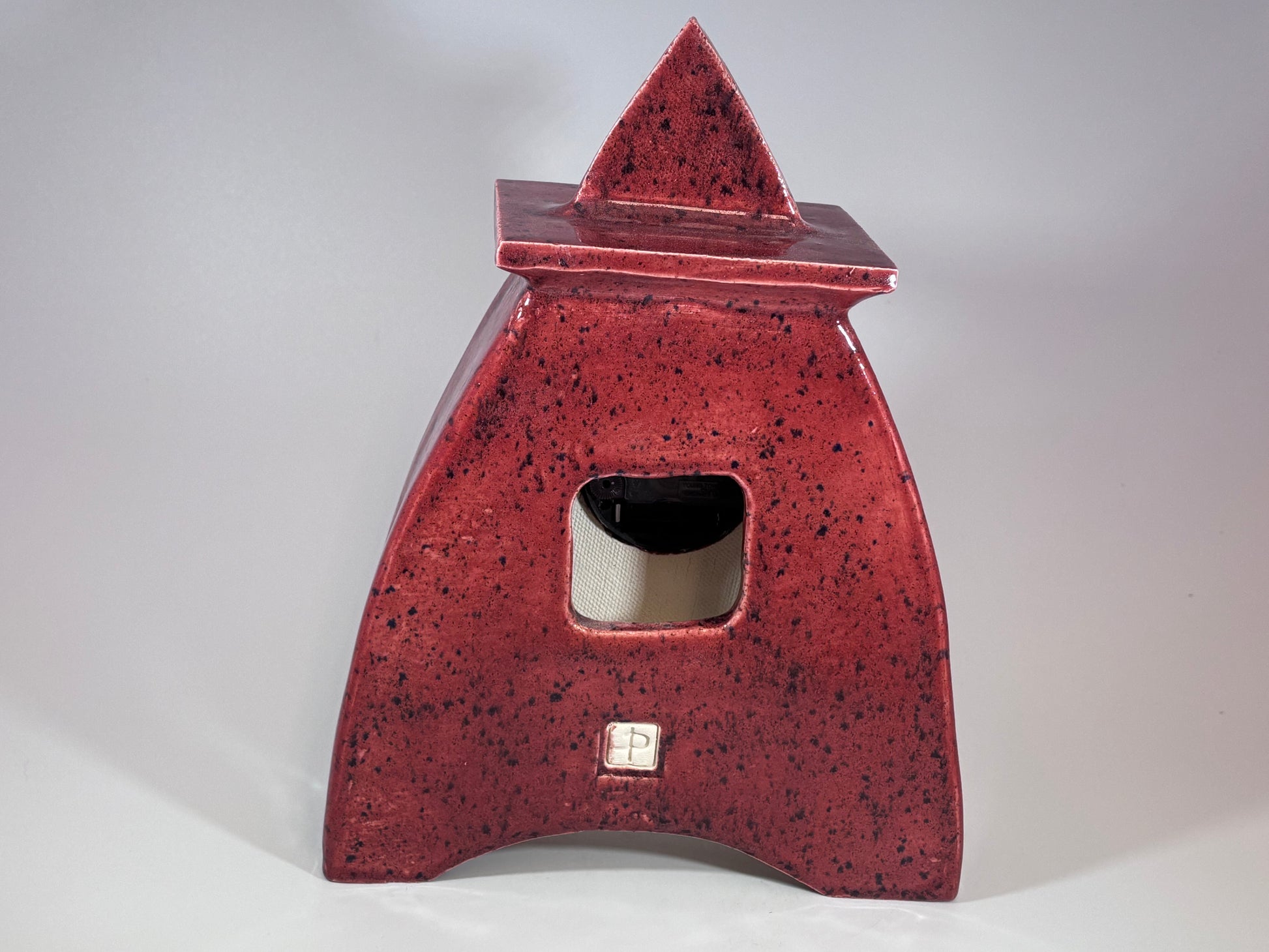 Art Deco-inspired mantel clock is a new ceramic clock design with an enclosed clock face is also ideal as a shelf clock. Designed by Peter Bowen in his small ceramics studio in the Somerset countryside. The glaze on this clock is a hand-applied red speckle colour.