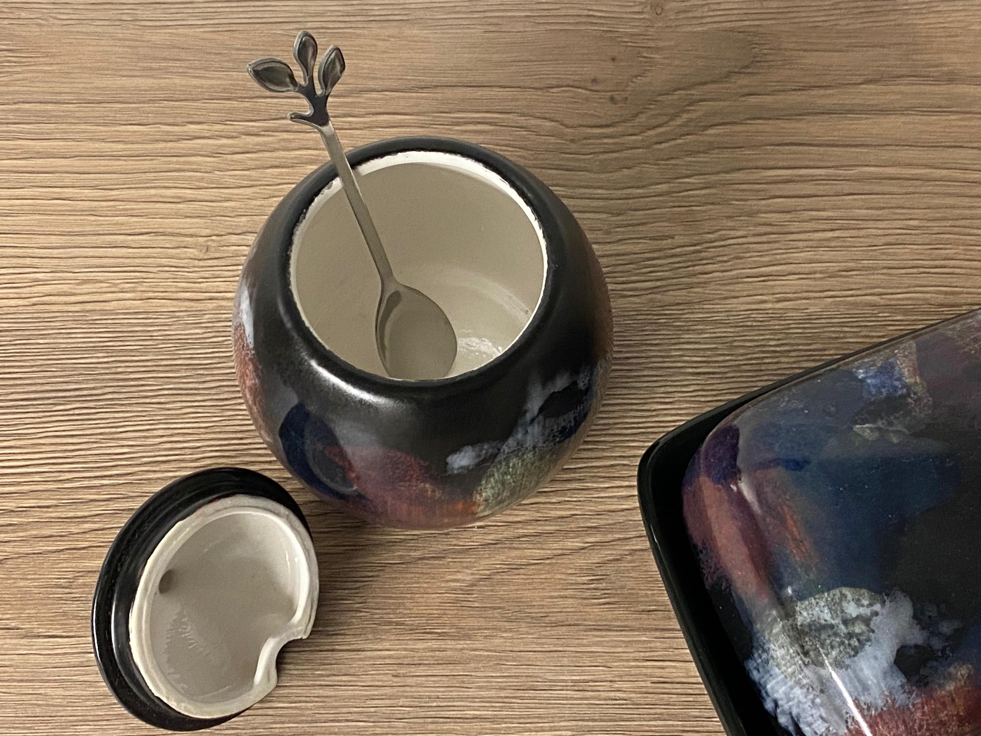 Ceramic butter dish with lid and a matching sugar bowl with lid and leafy spoon in an abstract glaze pattern.