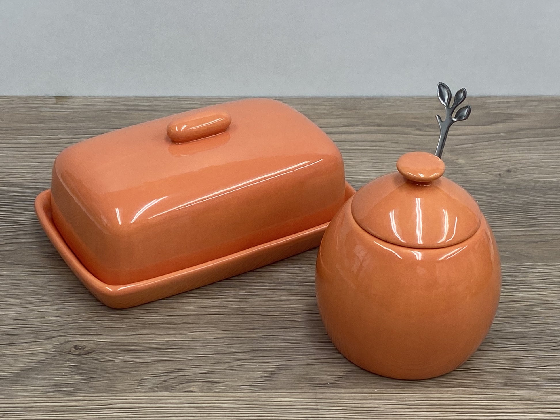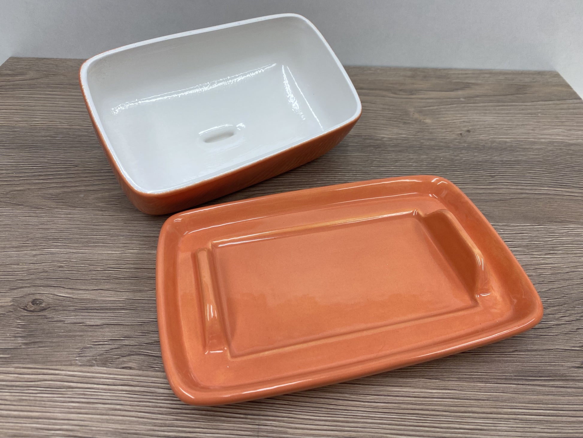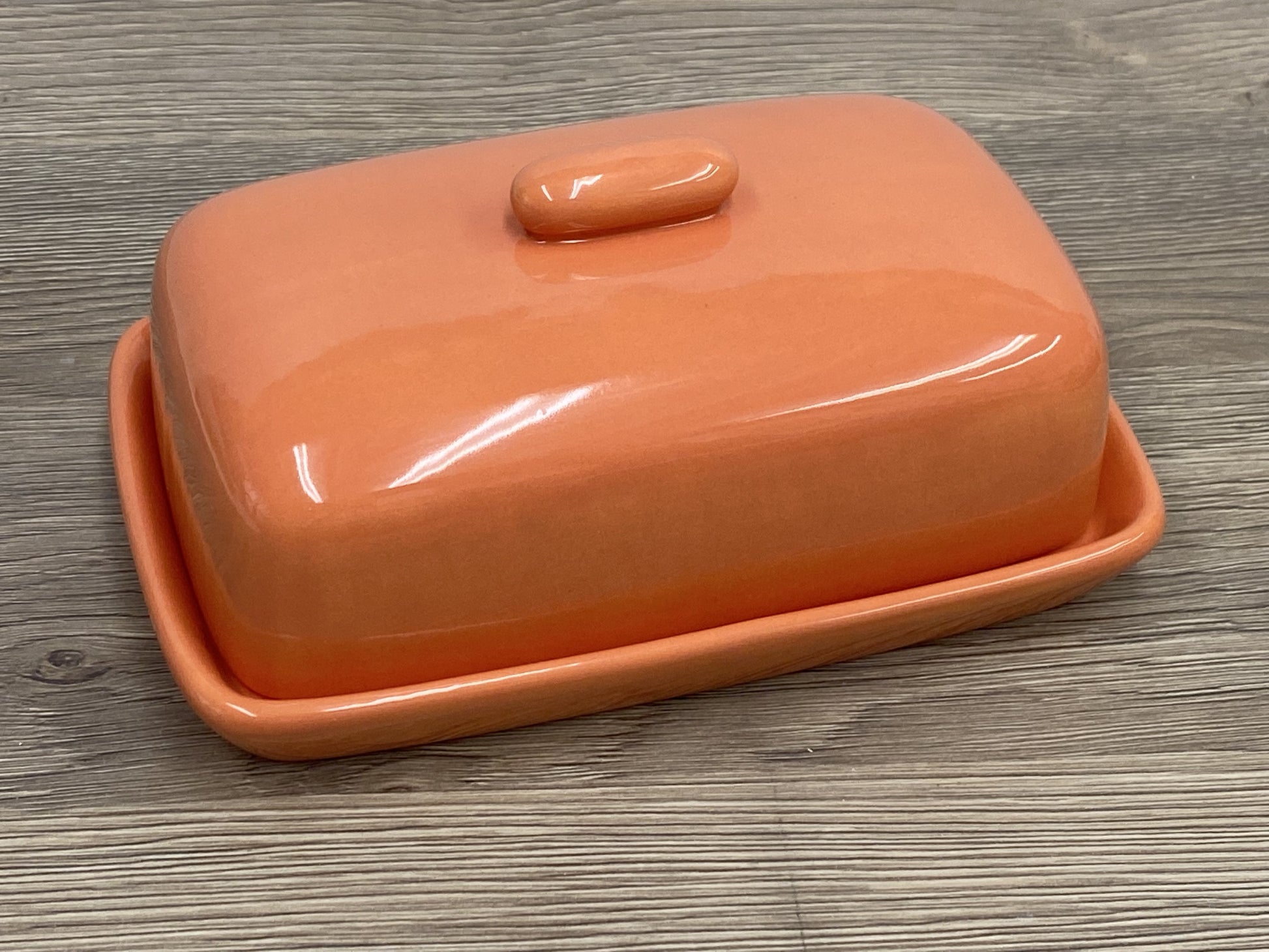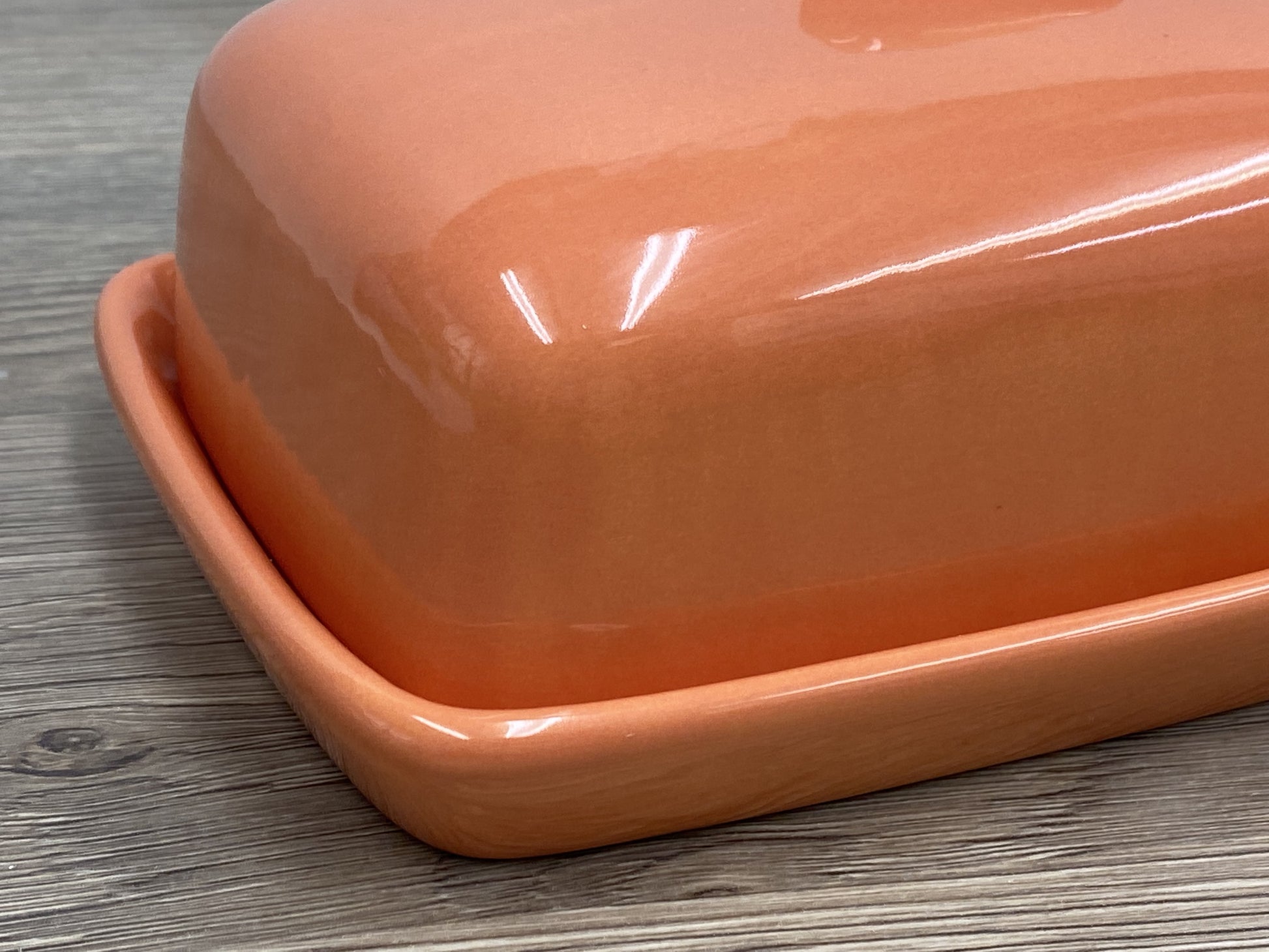 Butter dish with lid in a solid orange glaze for keeping butter fresh and spreadable. Microwave and dishwasher safe earthenware pottery butter keeper with a smooth surface dish and lid.