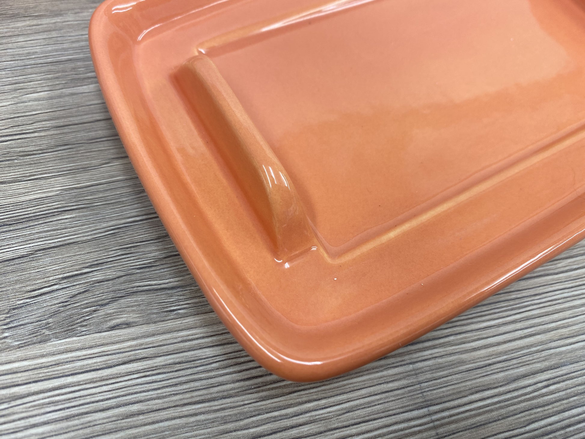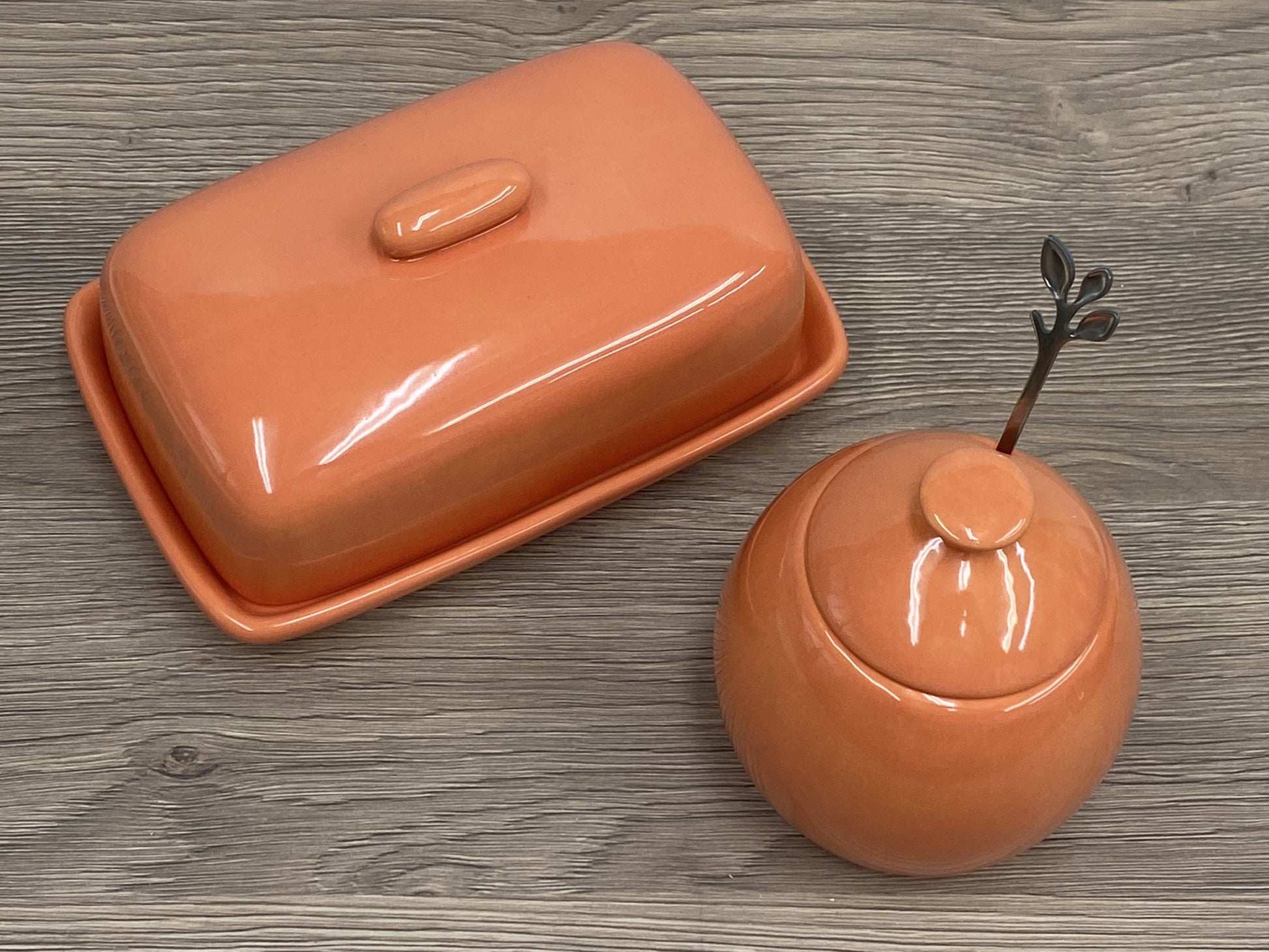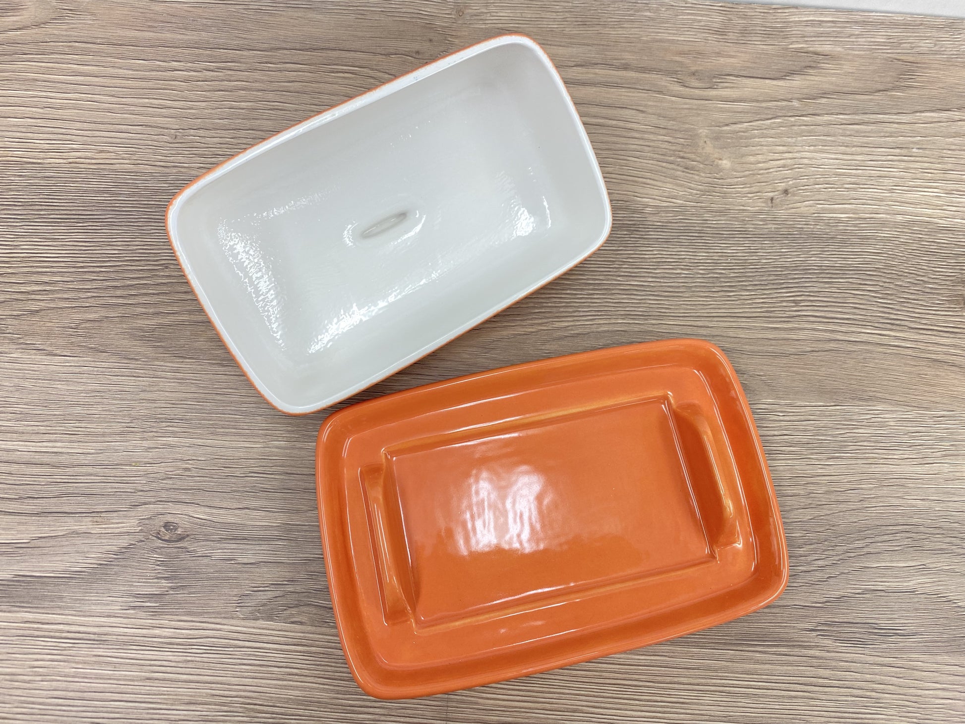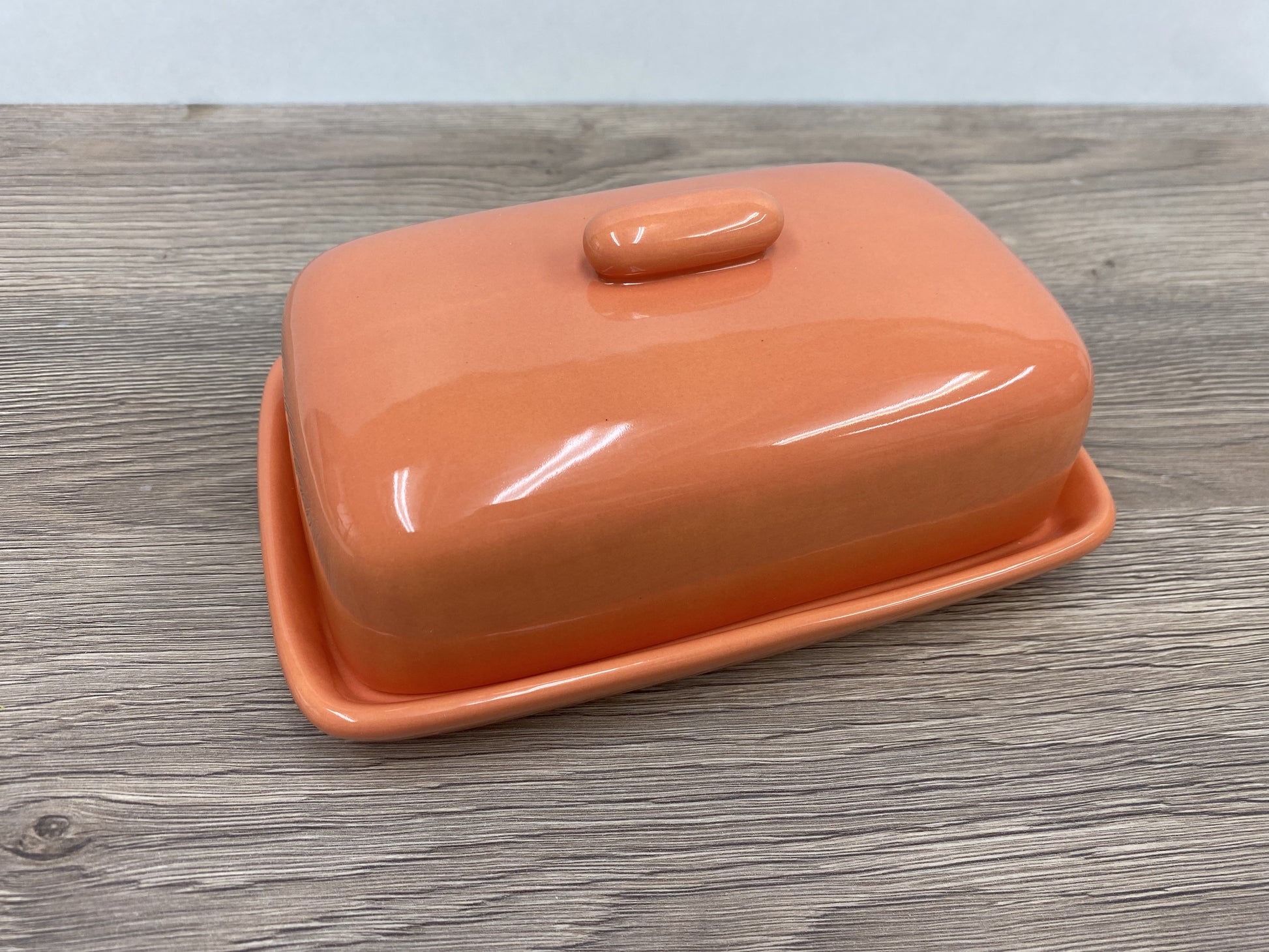 Butter dish with lid in a solid orange glaze for keeping butter fresh and spreadable. Microwave and dishwasher safe earthenware pottery butter keeper with a smooth surface dish and lid.