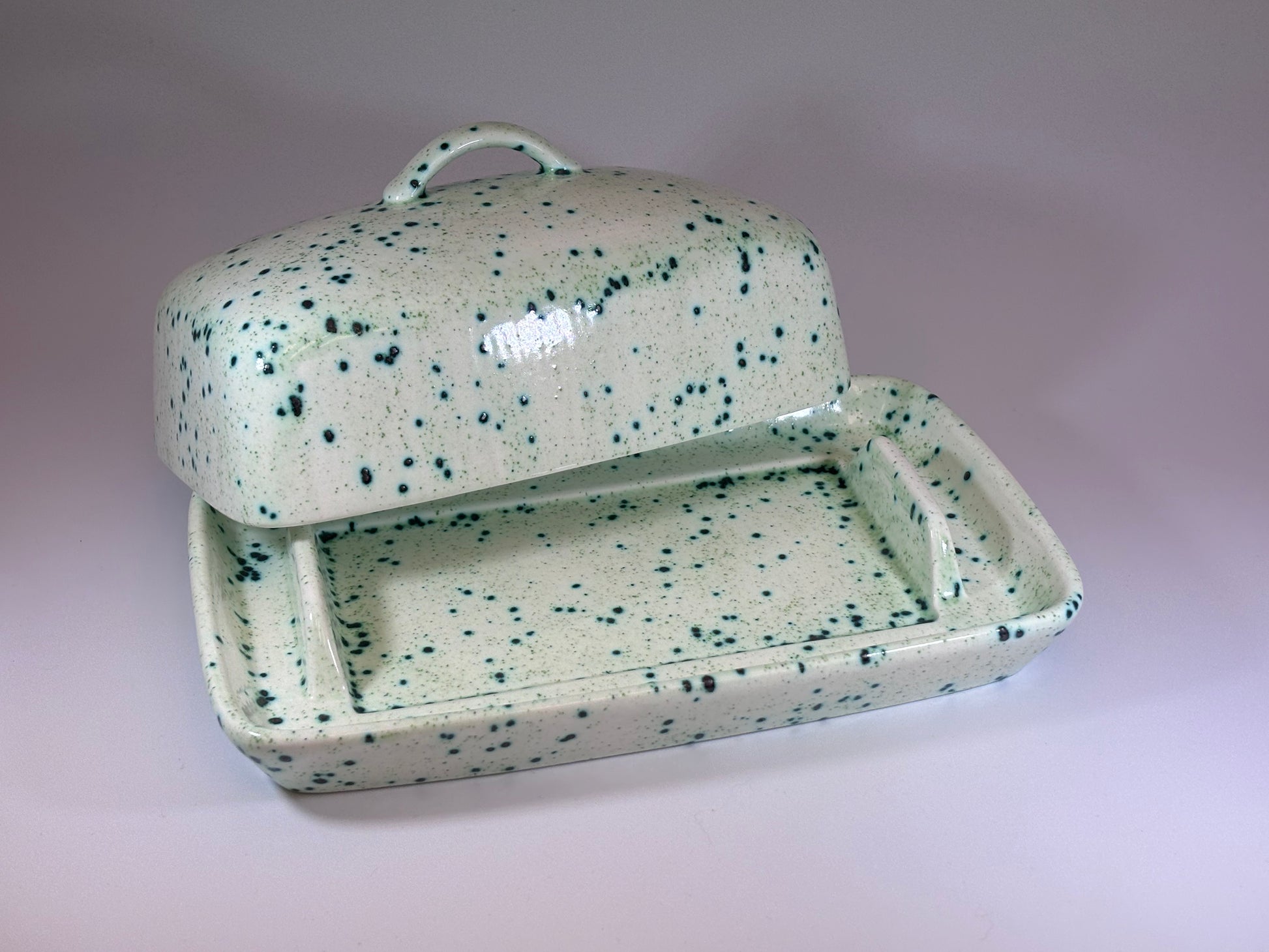 Also available is the matching Sugar Bowl with spoon https://peterbowenart.co.uk/products/butter-dish-and-sugar-bowl-speckled-green