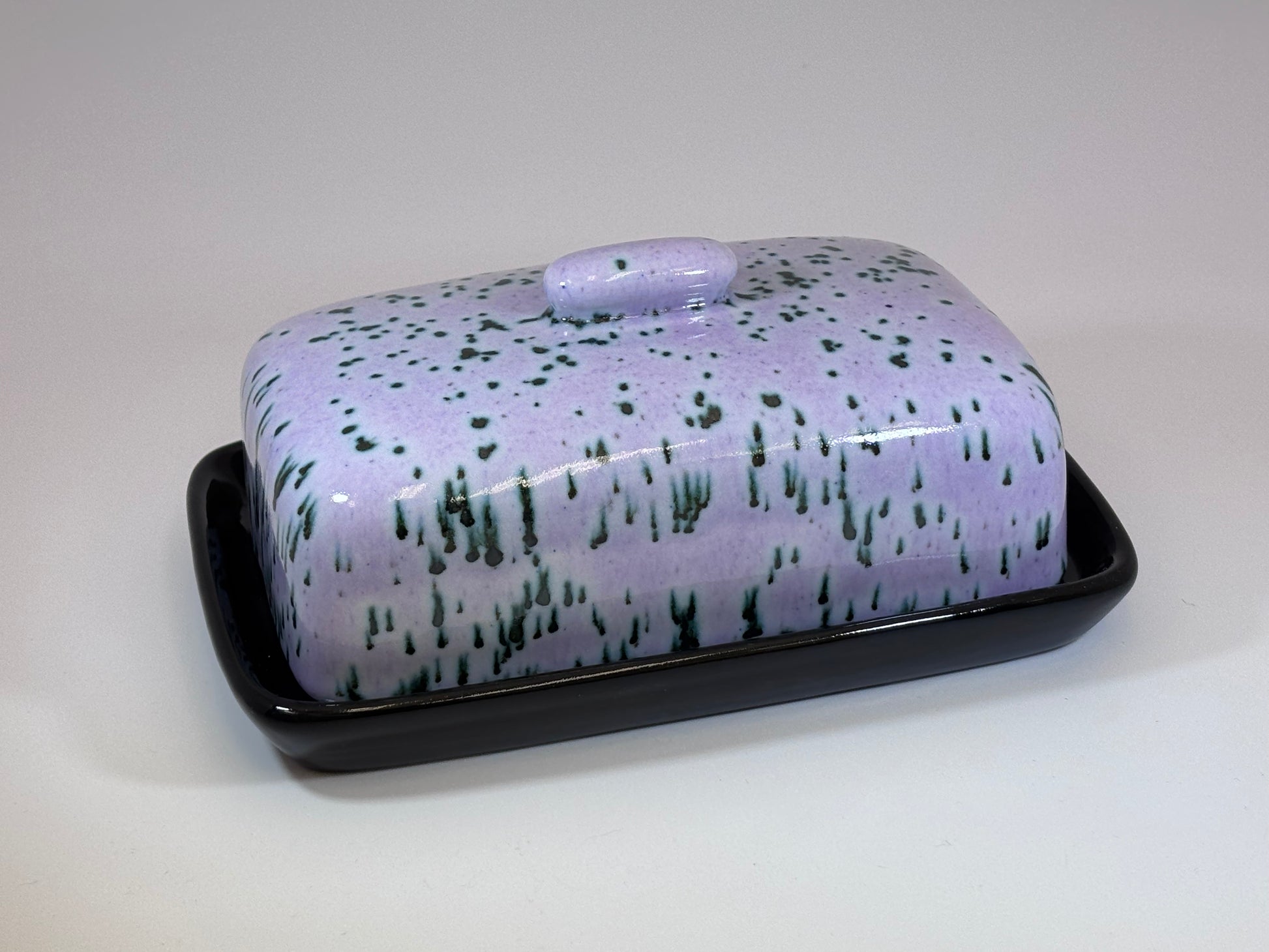 An unusual ceramic butter dish with lid is earthenware pottery with a purple speckle ceramic glaze with jet black glazed dish.