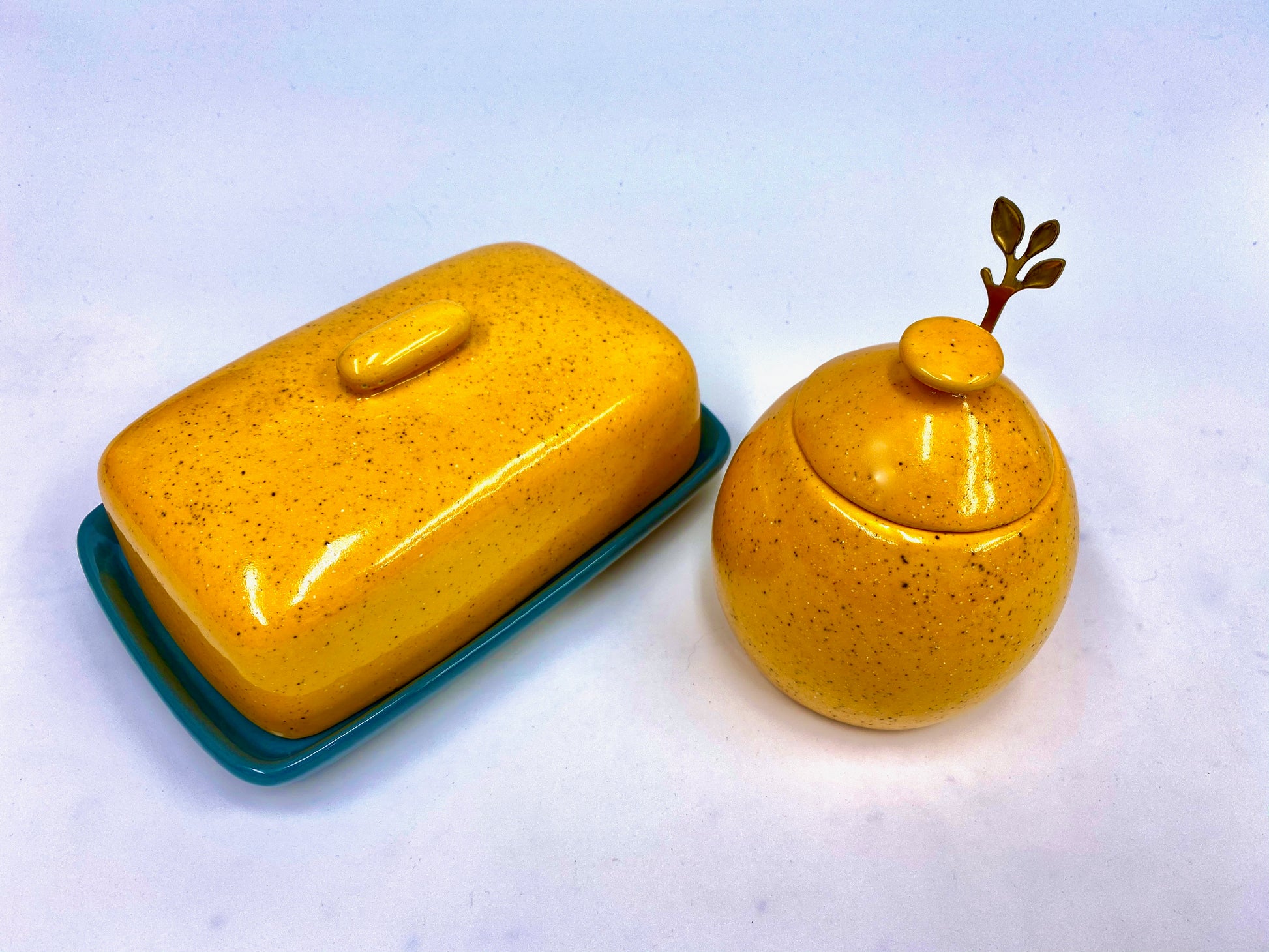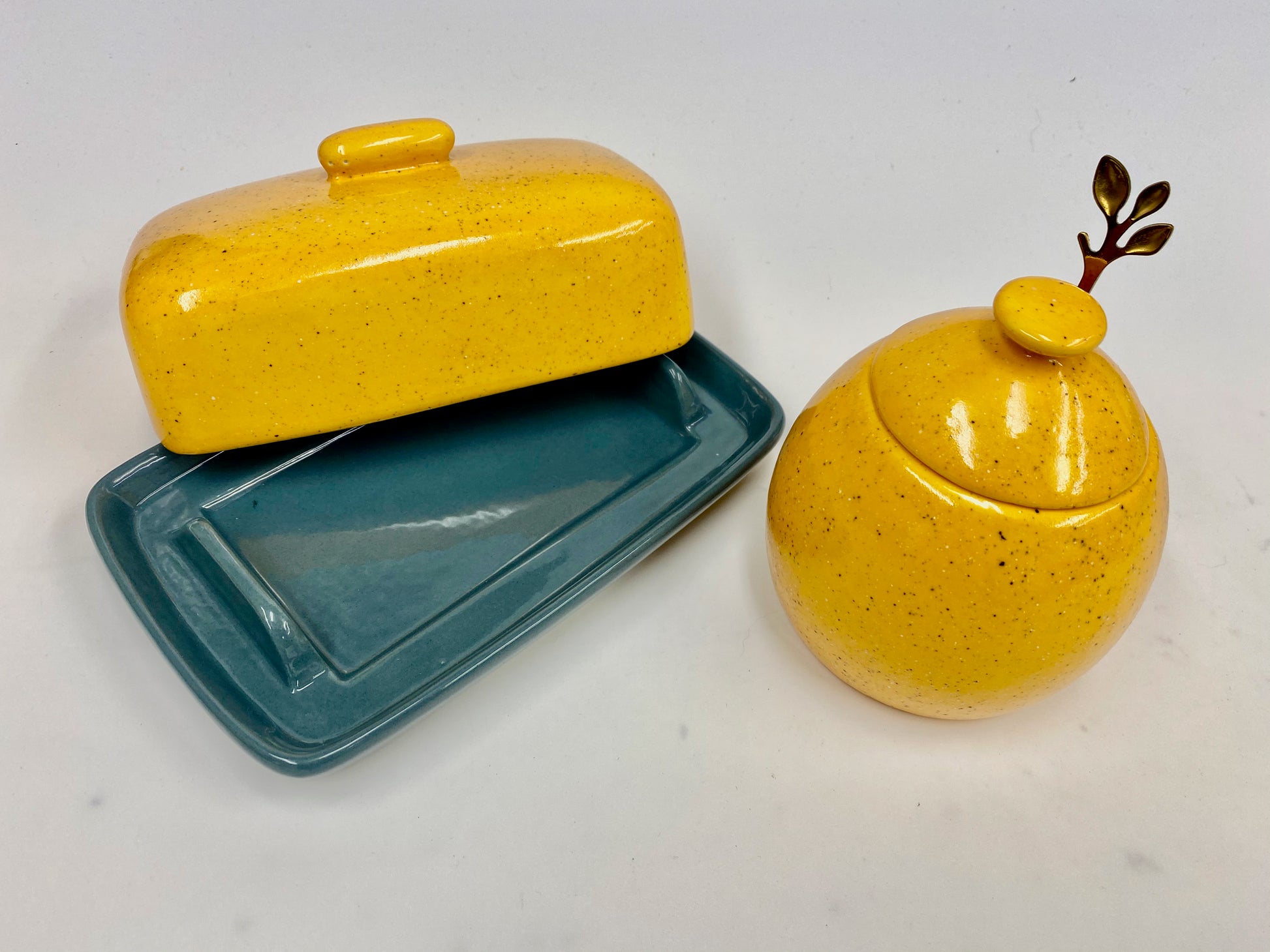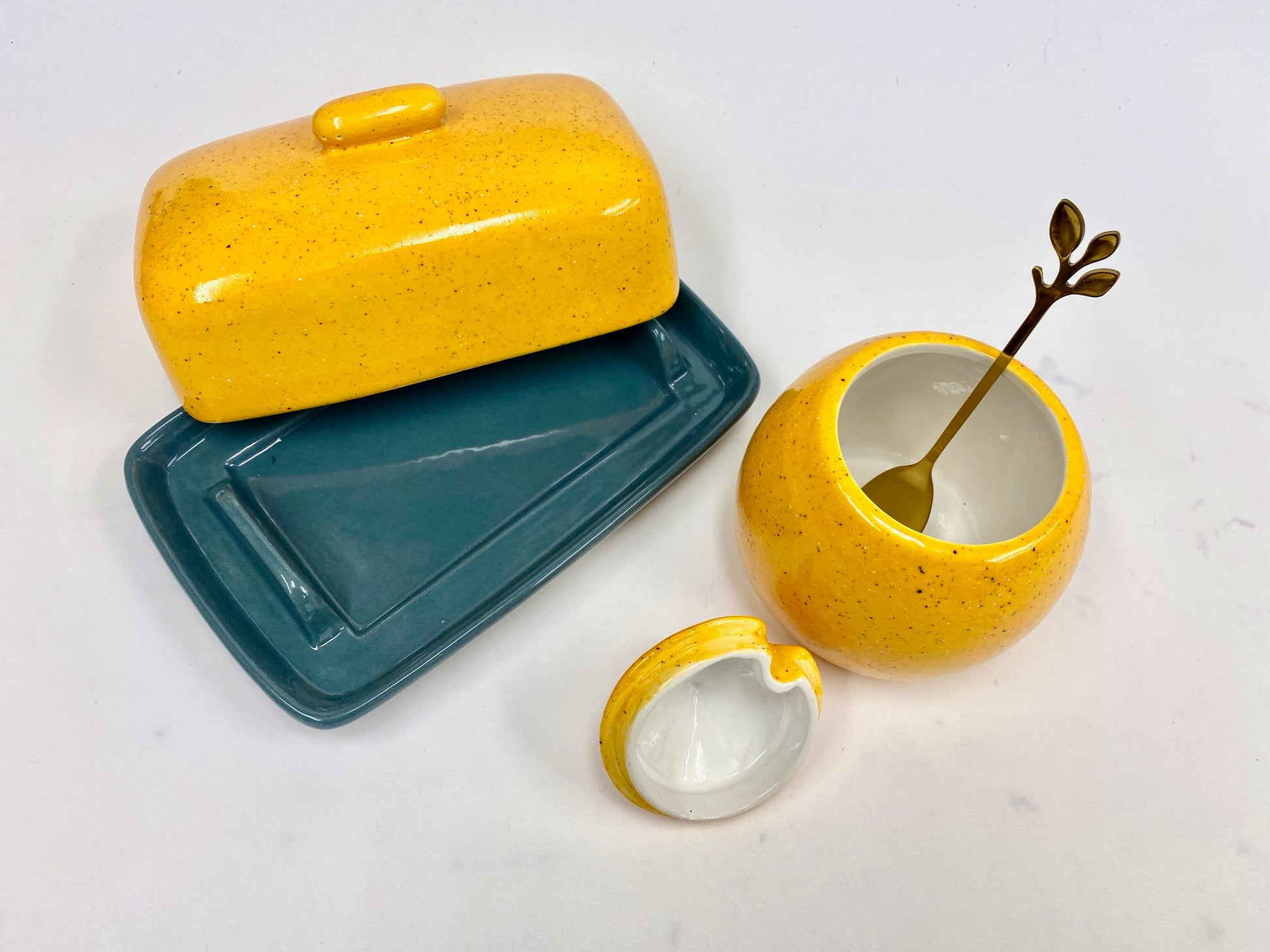 Ceramic butter dish with lid in a glossy Speckled Yellow Glaze with matching Sugar Bowl with Spoon.