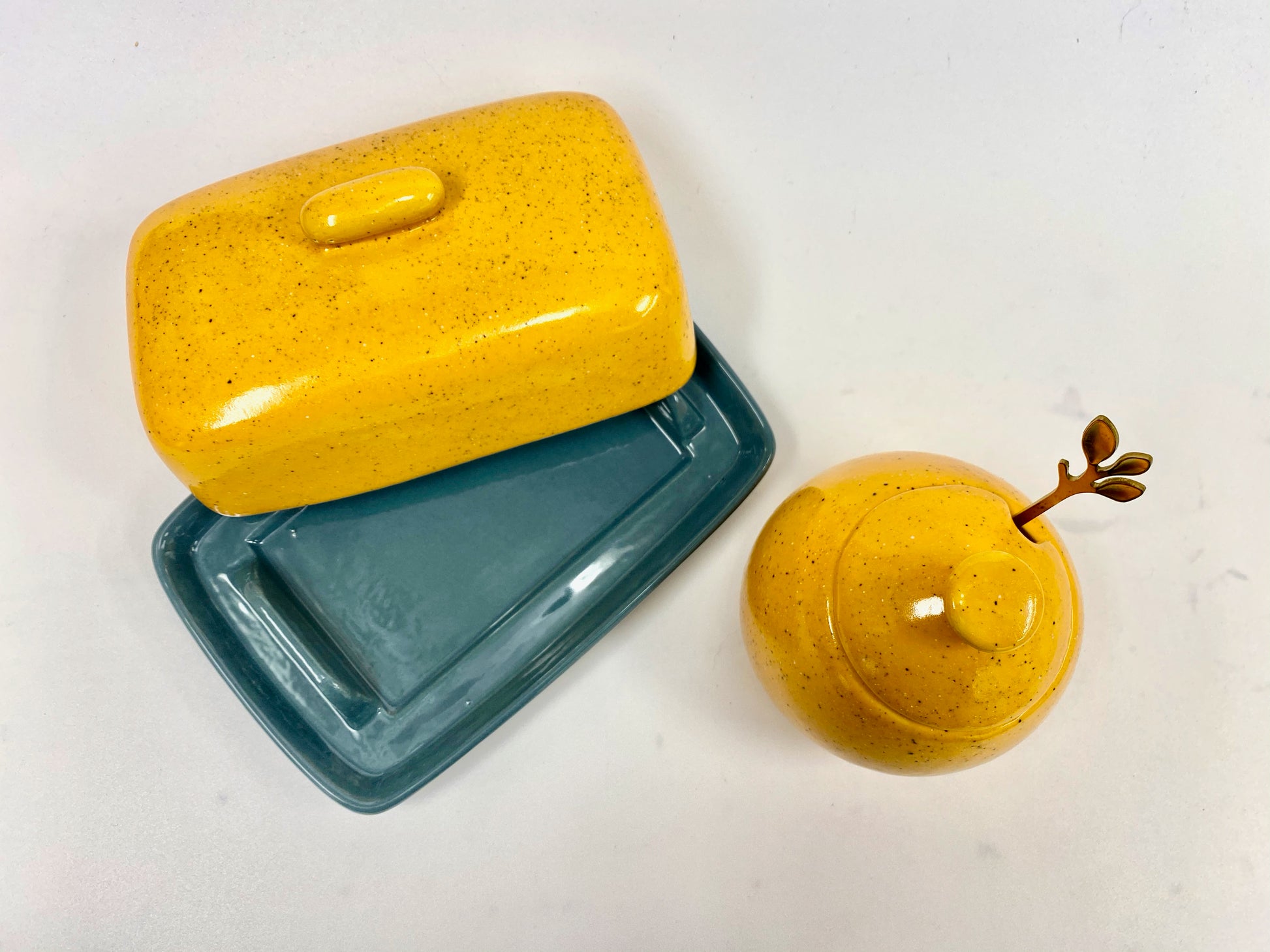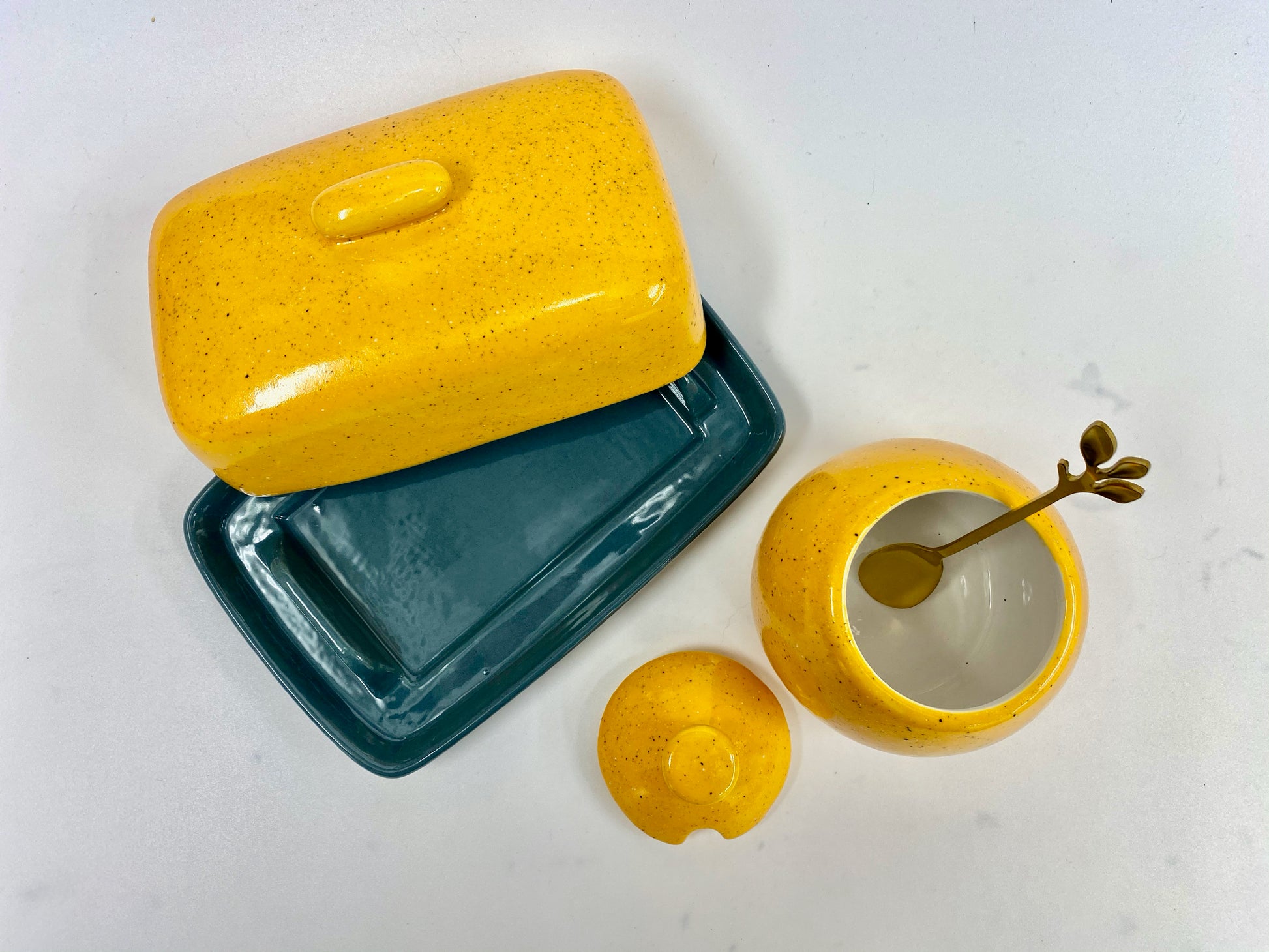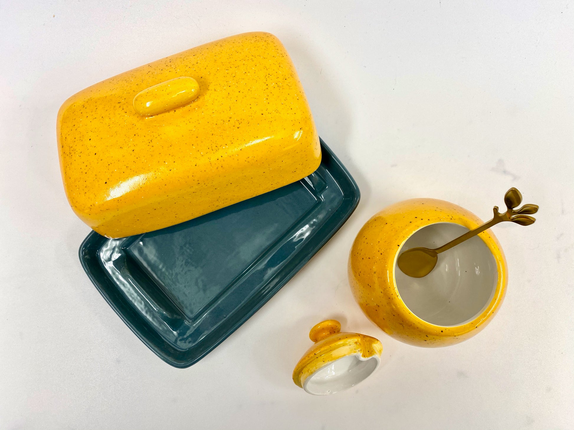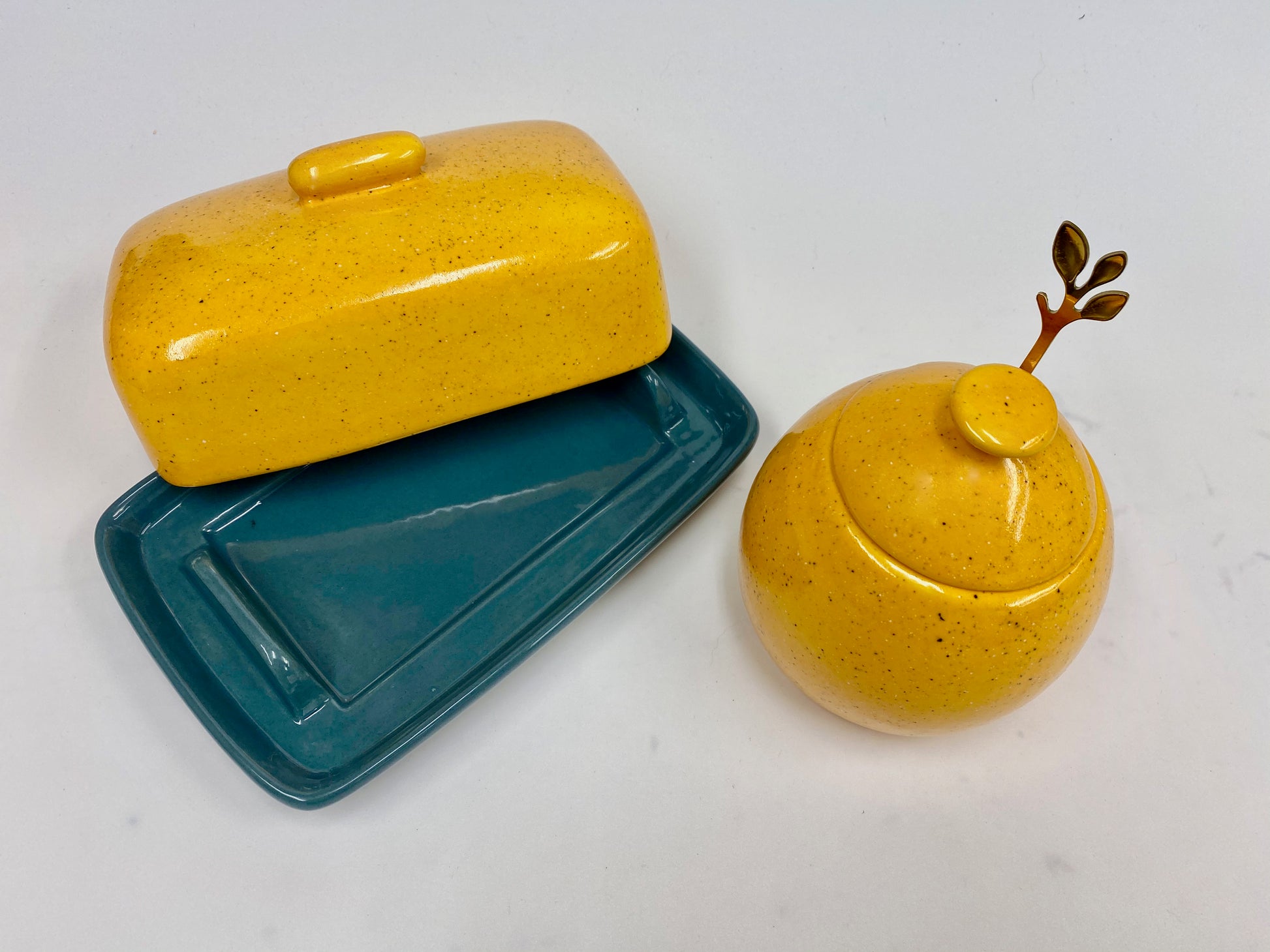 Ceramic butter dish with lid in a glossy Speckled Yellow Glaze with matching Sugar Bowl with Spoon.