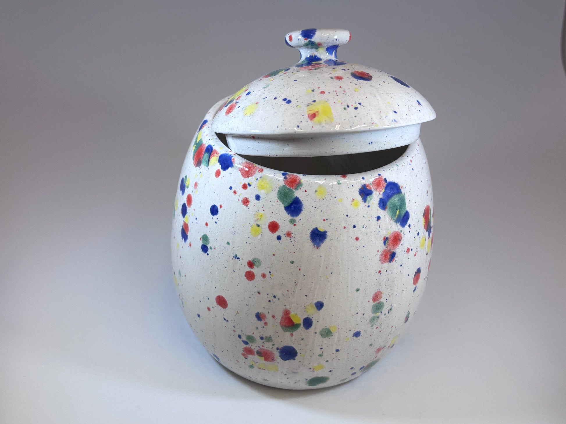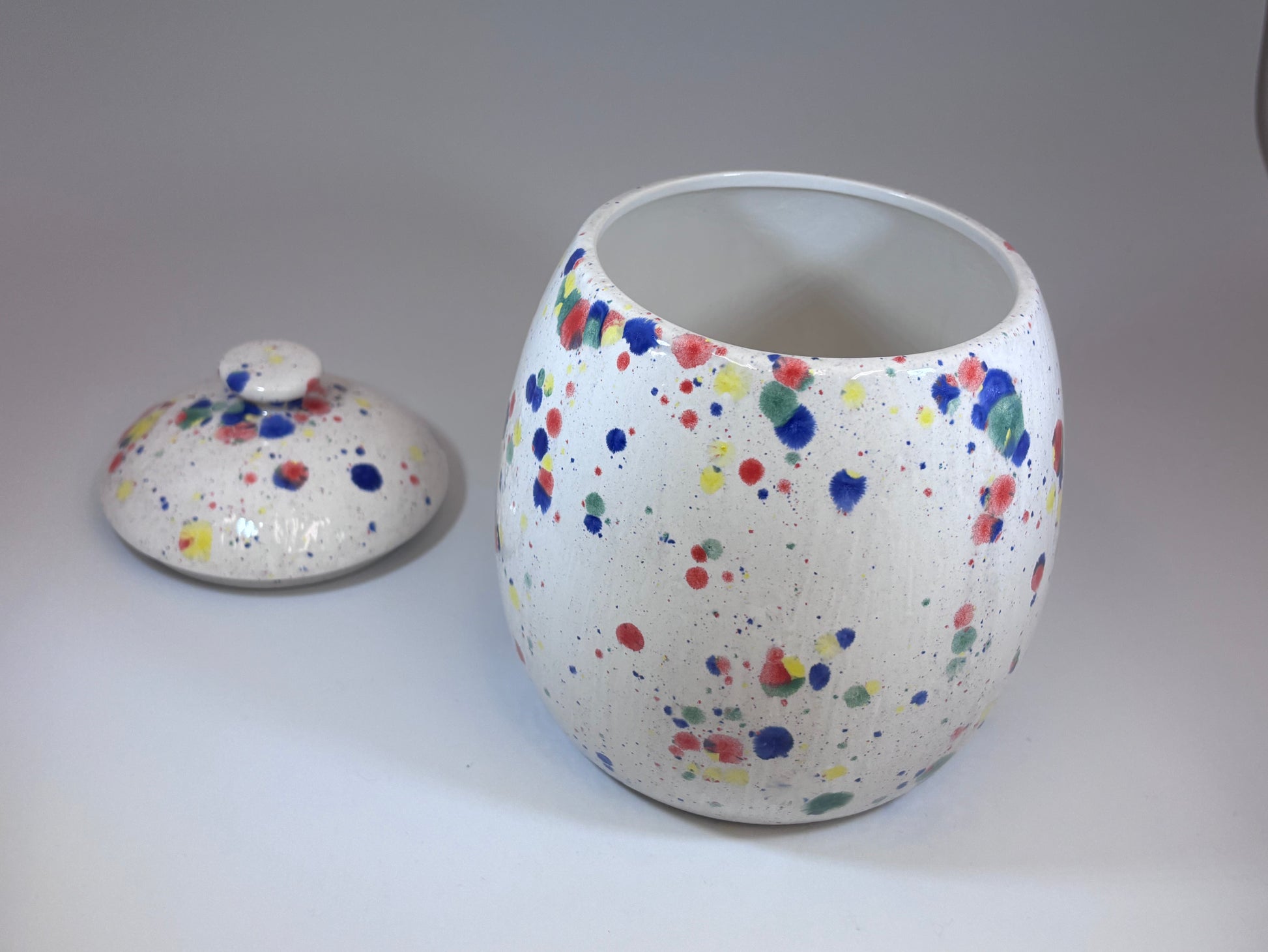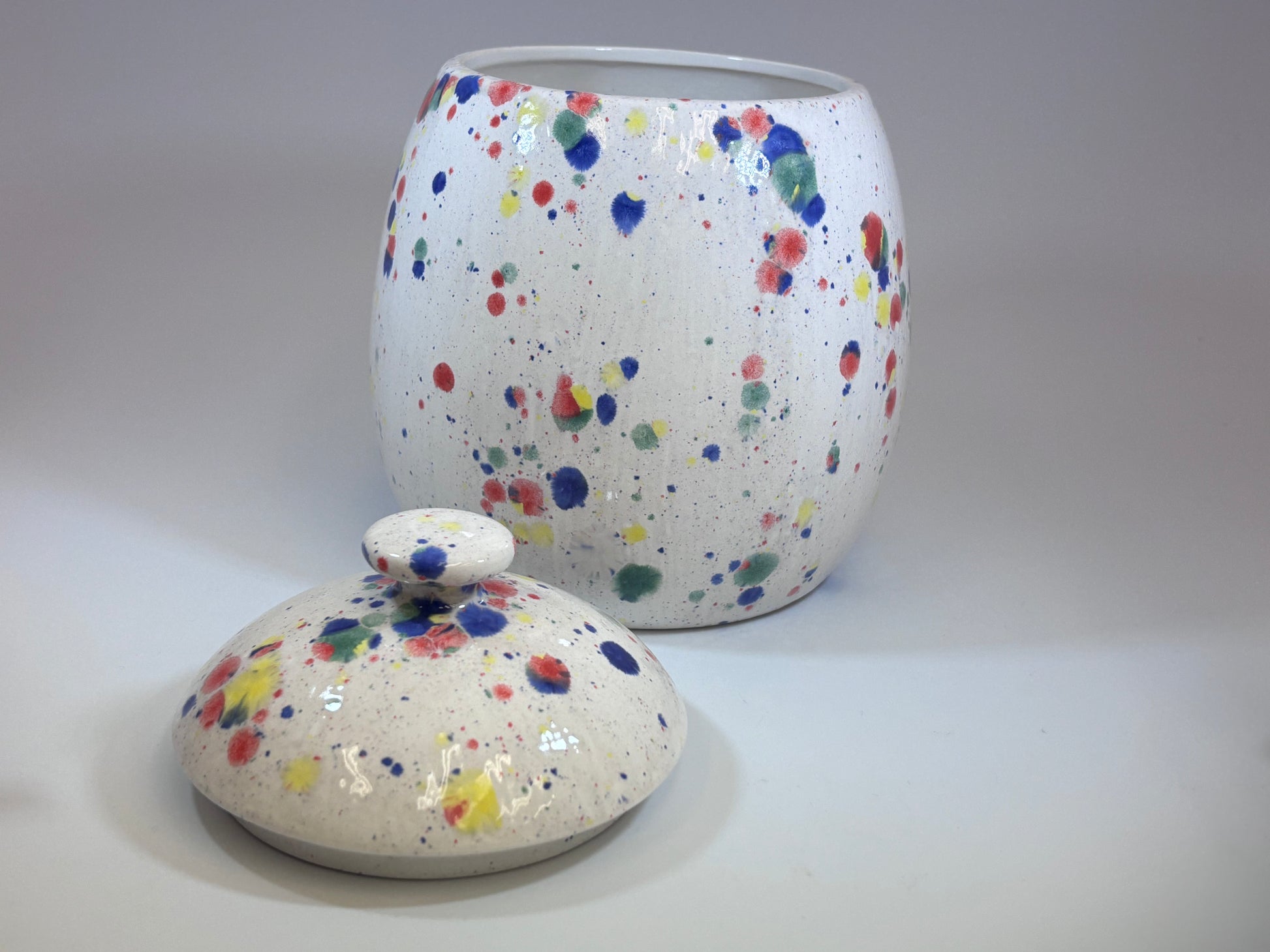 A uniquely designed handmade cookie jar/biscuit canister with unusual random splashes of colour makes an ideal housewarming gift or for that someone special a place to hide your chocolate chip cookies or digestives...!