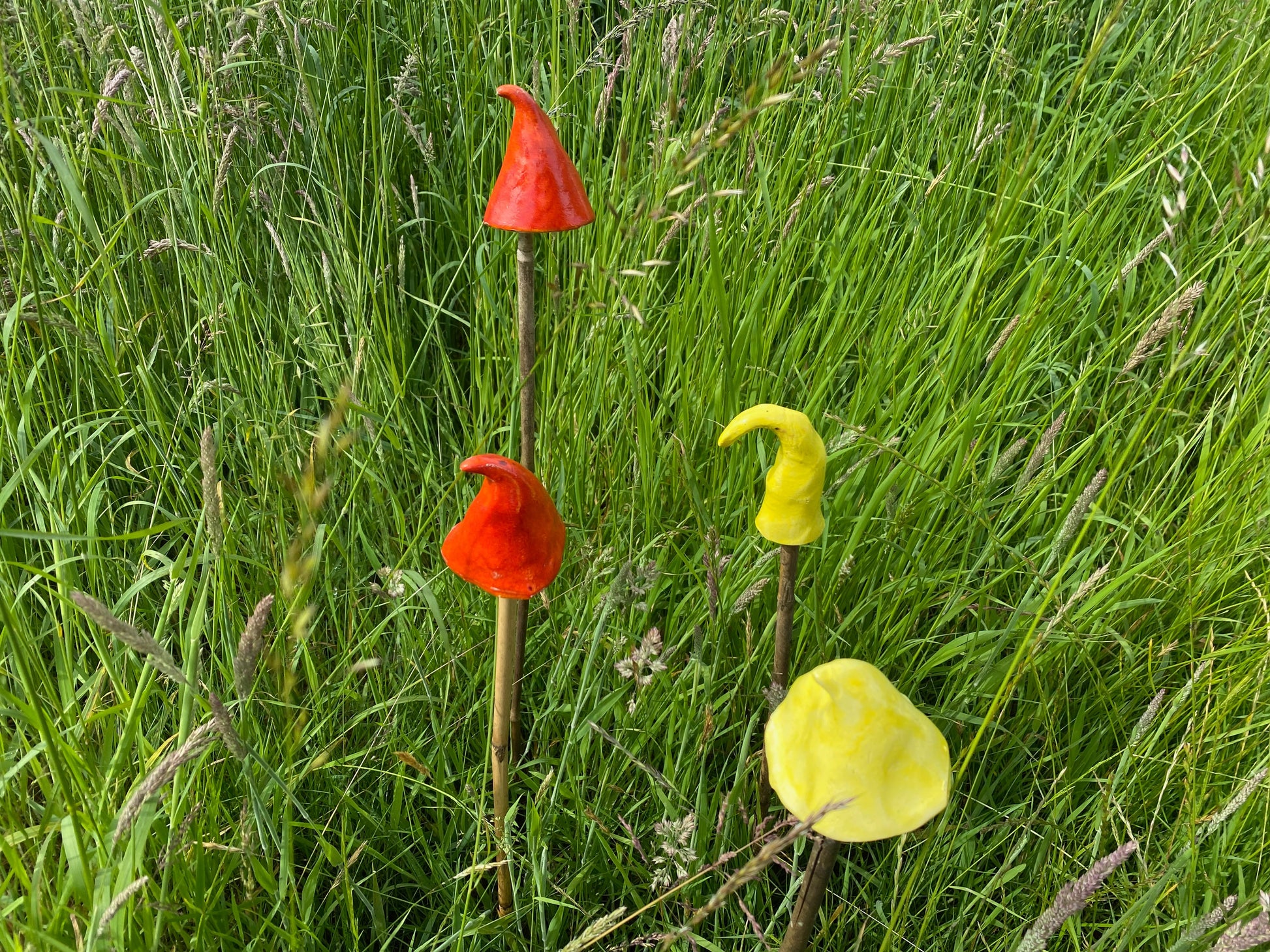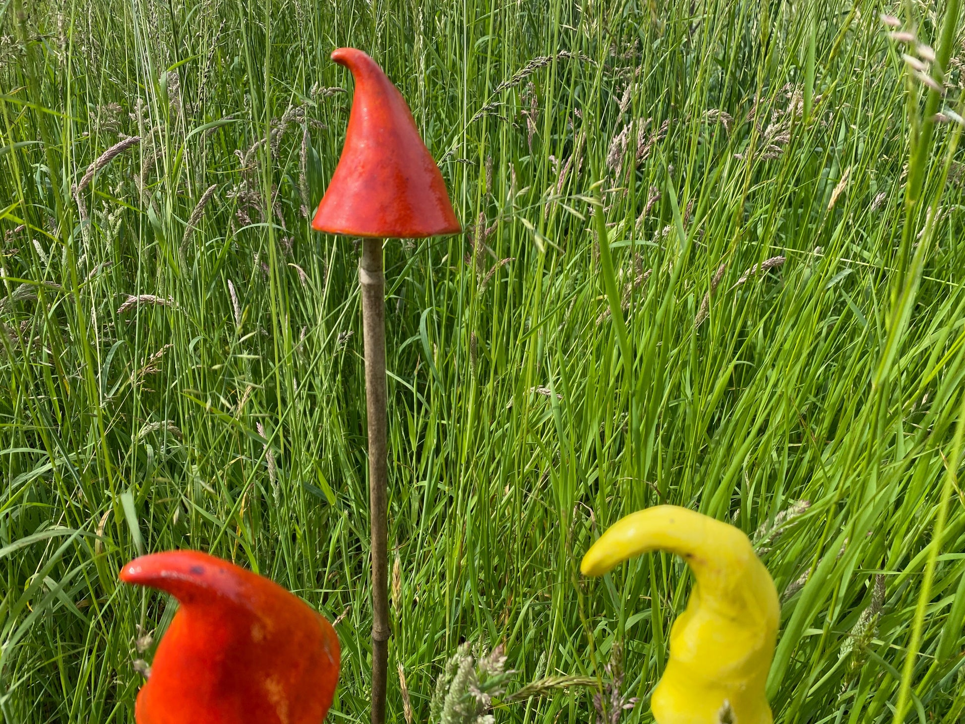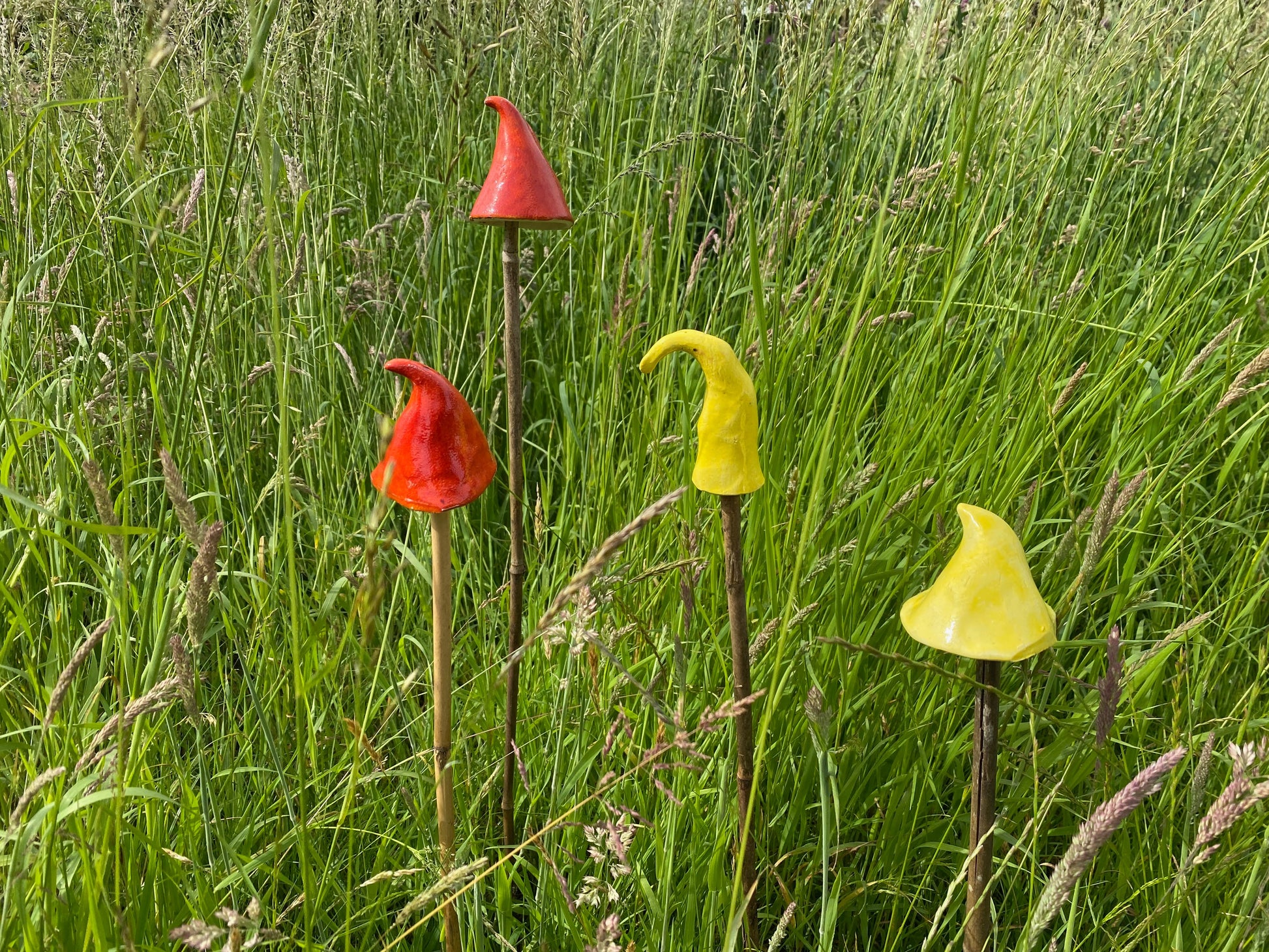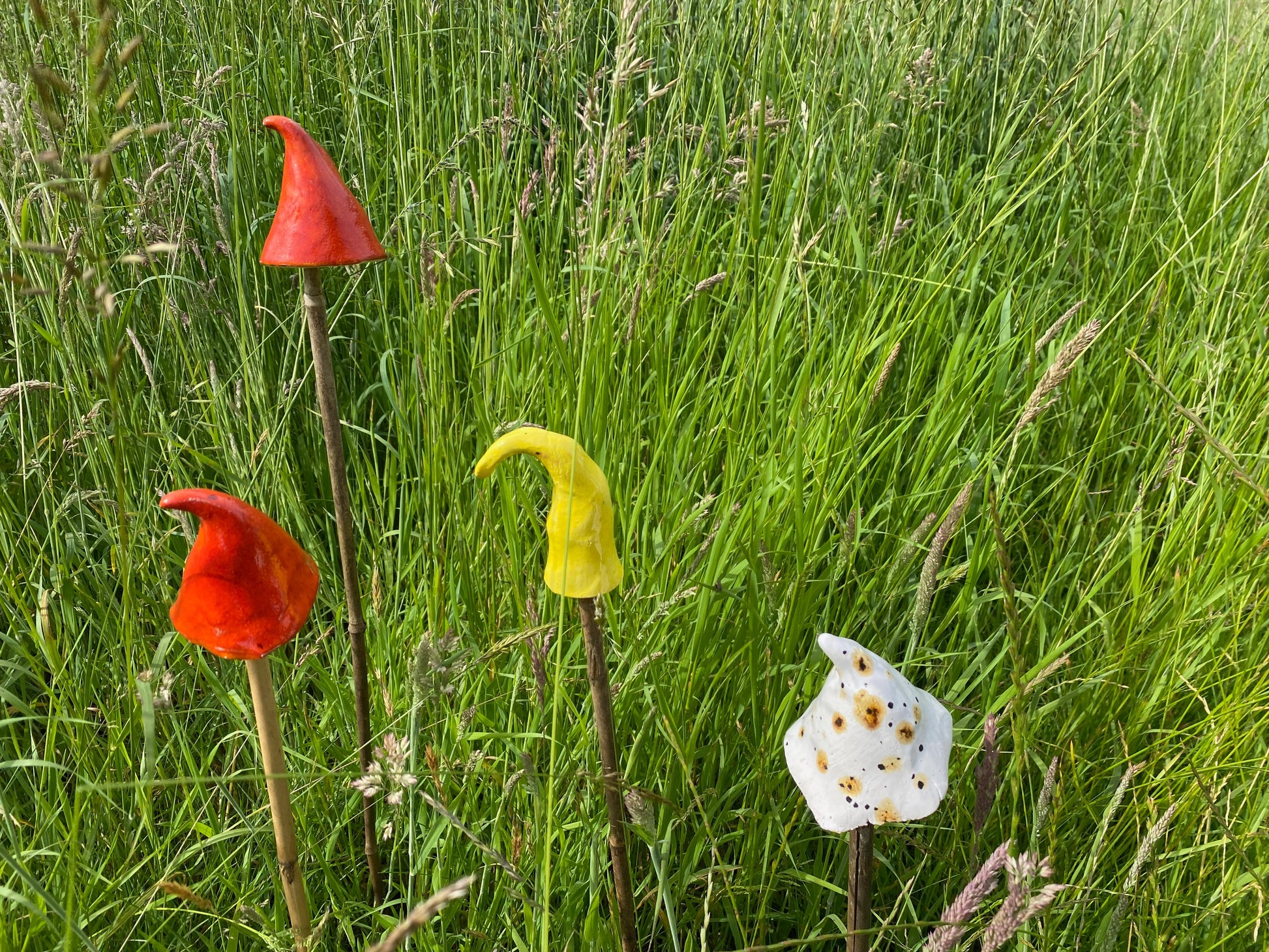 Brighten up any garden, field, window box, patio with these brightly coloured ceramics. You supply your own canes, sticks, etc and these handmade ceramic mushroom shapes simply sit on top.