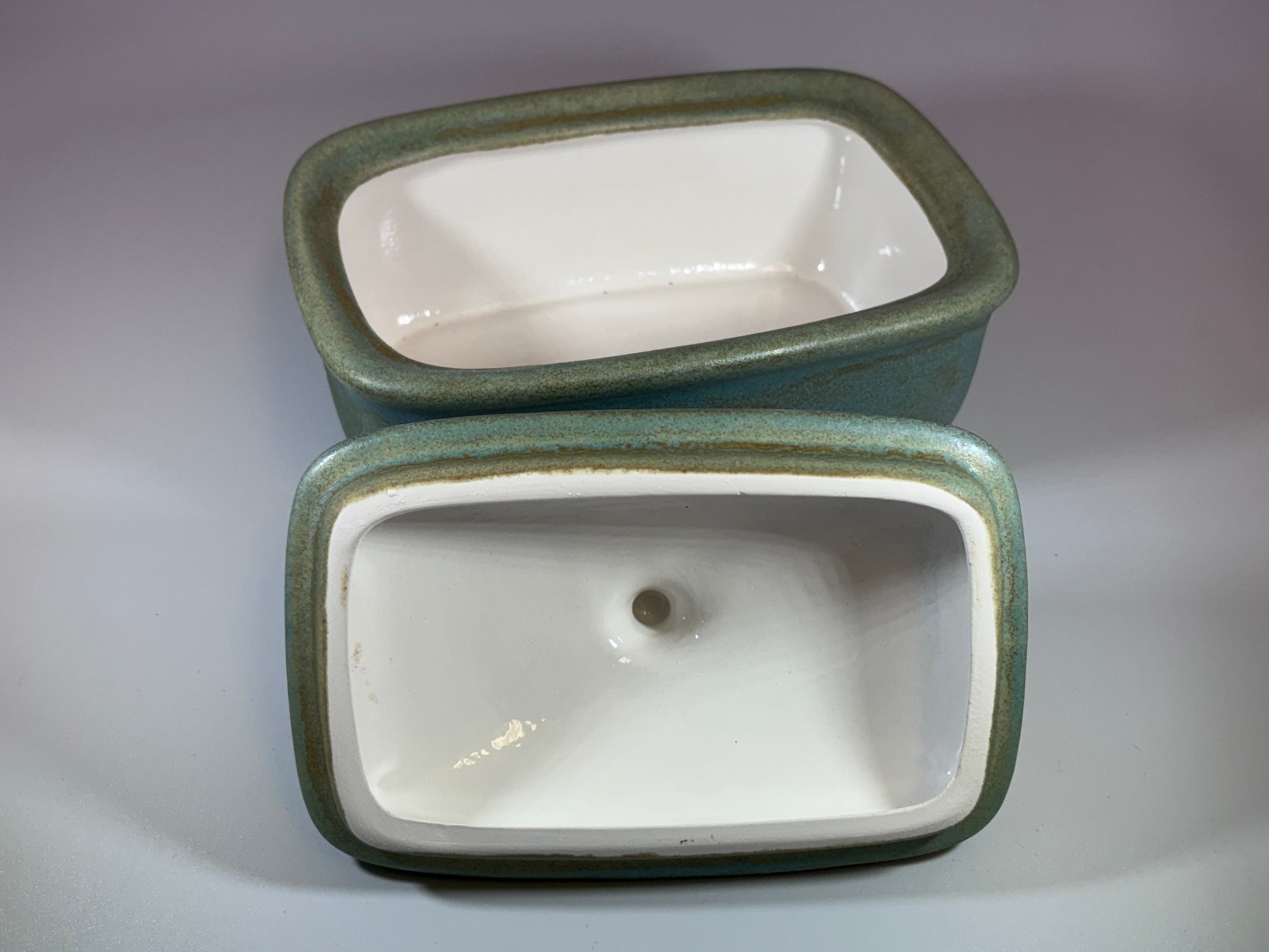 A butter dish with a lid in a green glaze with a food safe white interior.