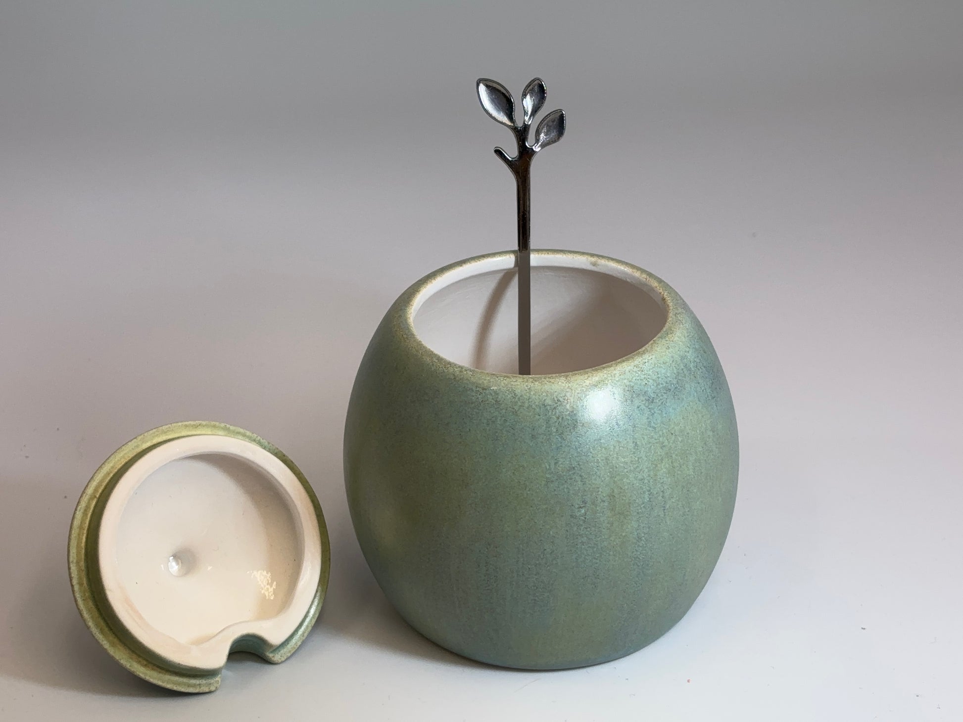 Ceramic sugar bowl with matching lid and a stainless steel leafy spoon finished with a Cornish Copper glaze.
