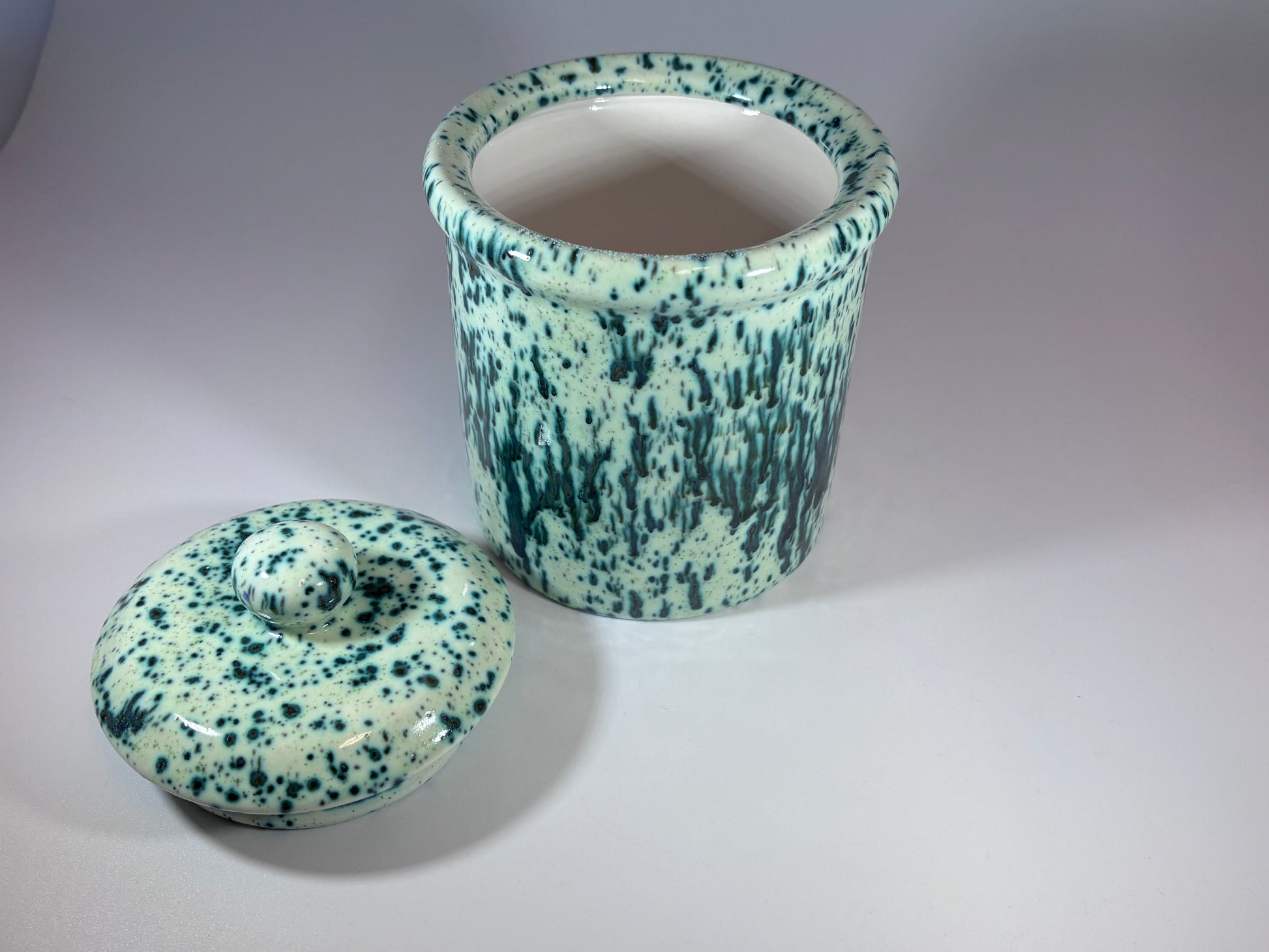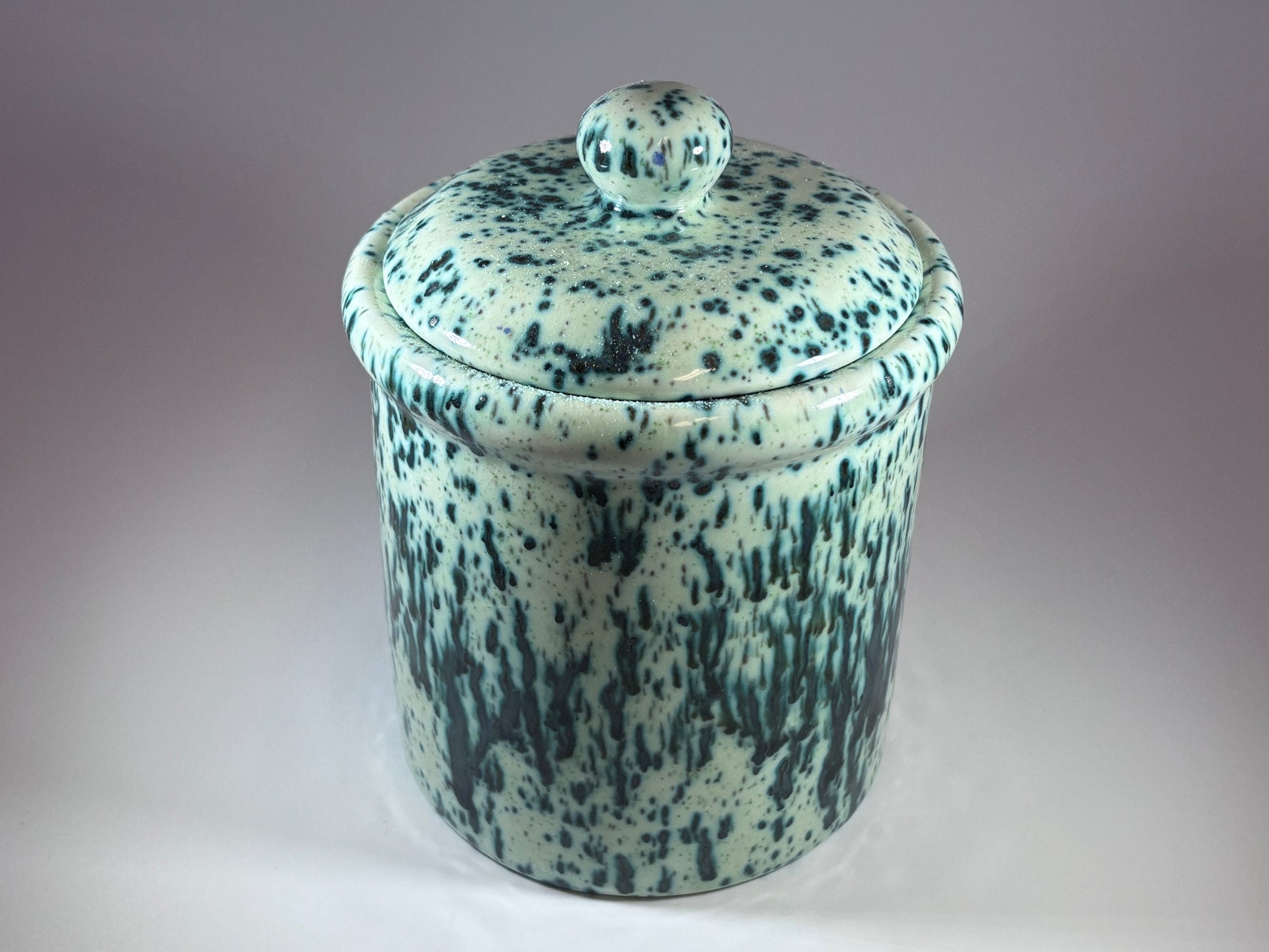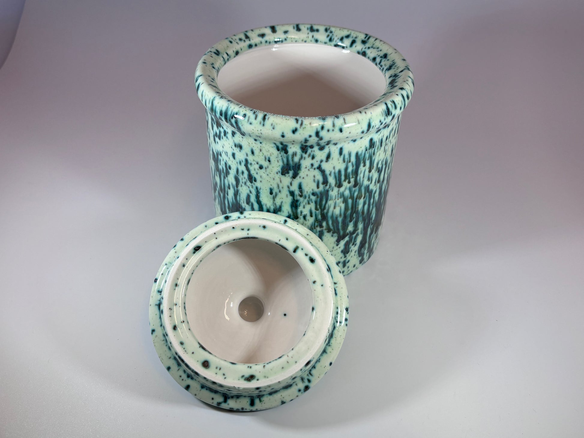This canister and lid measures 150mm (6 inches) high x 104mm (4 inches) in diameter.