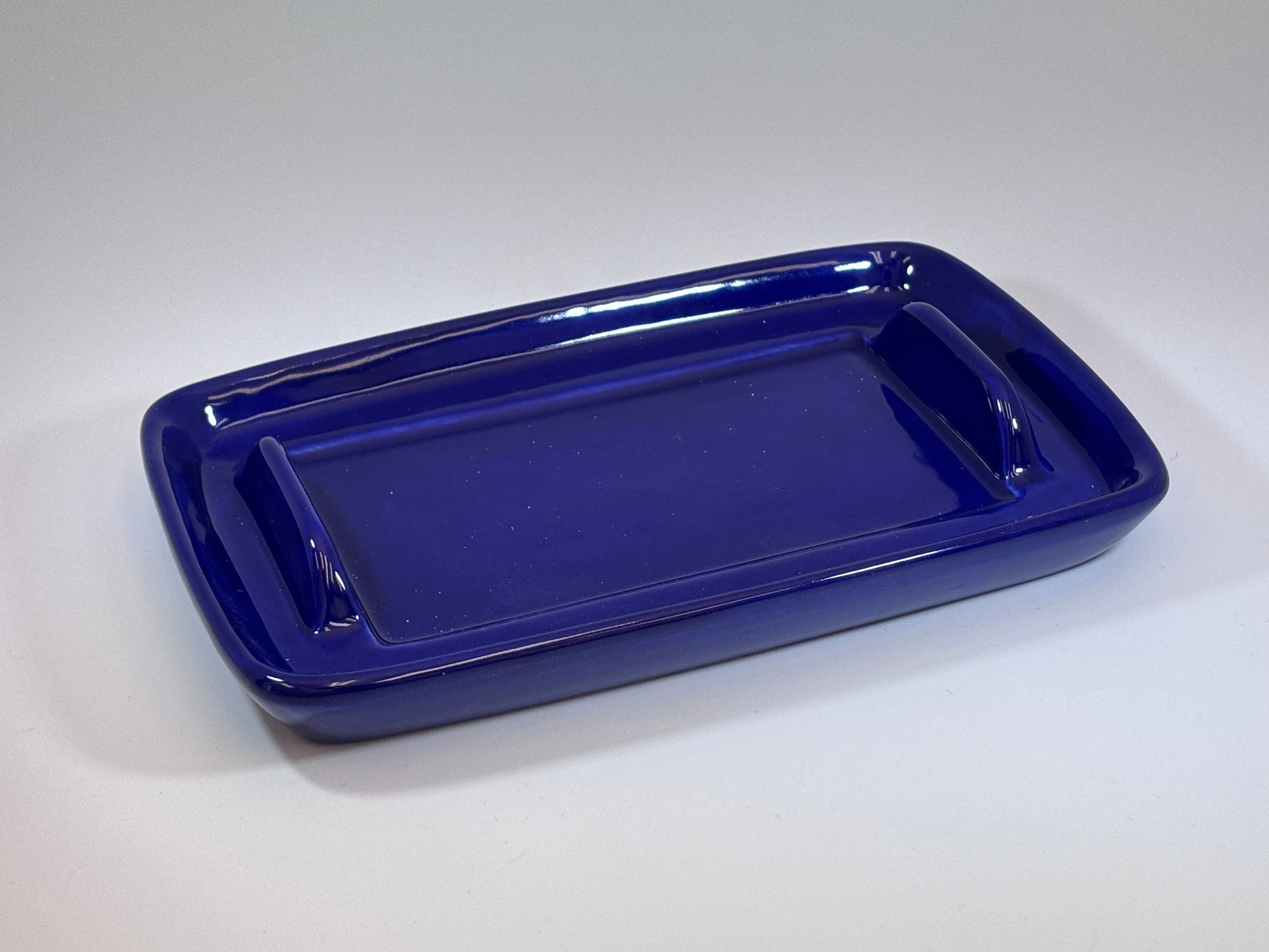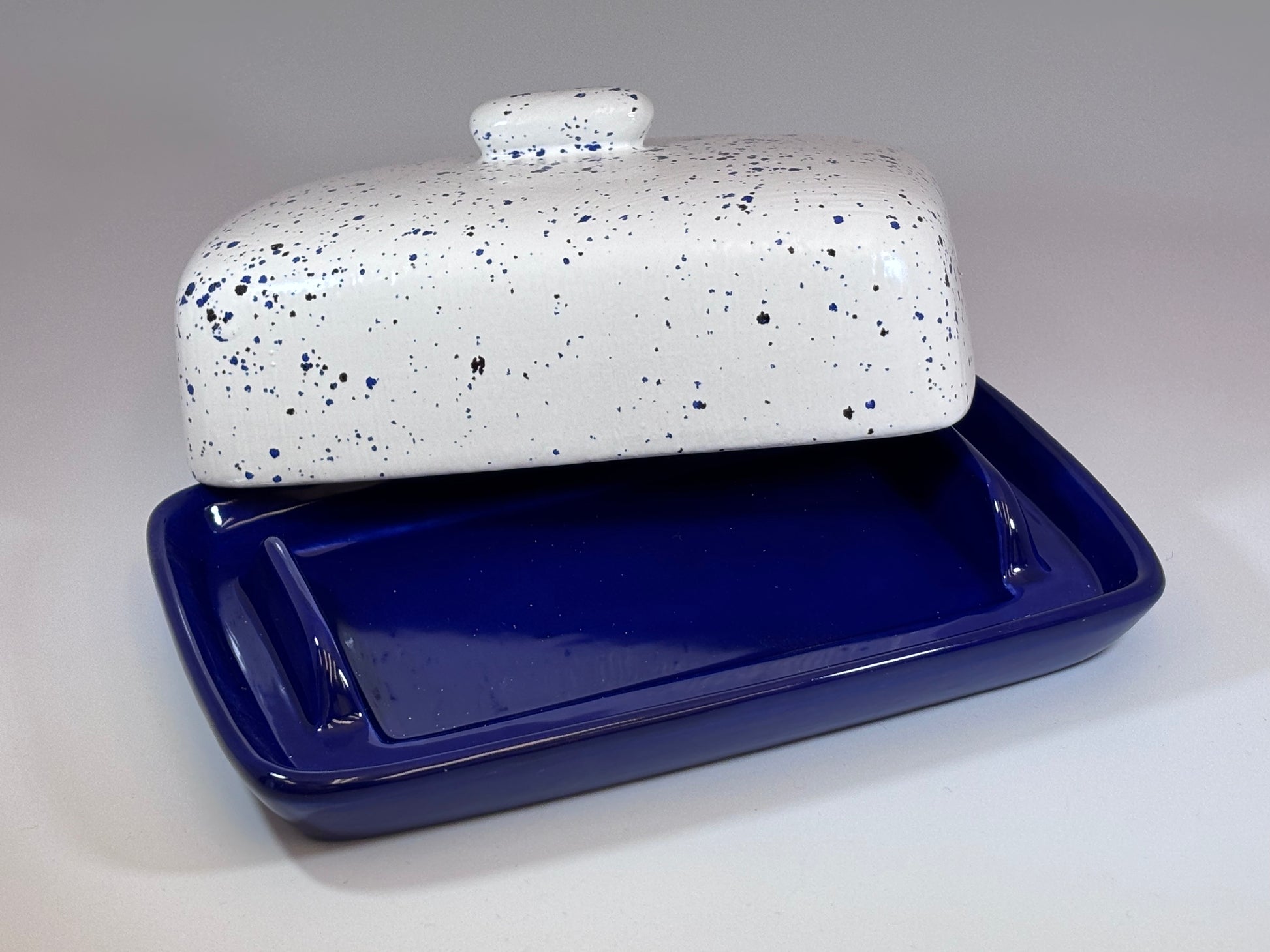 A lovely handmade pottery butter dish with lid has a rich royal blue glazed dish and a speckled blue and white hand glazed lid.