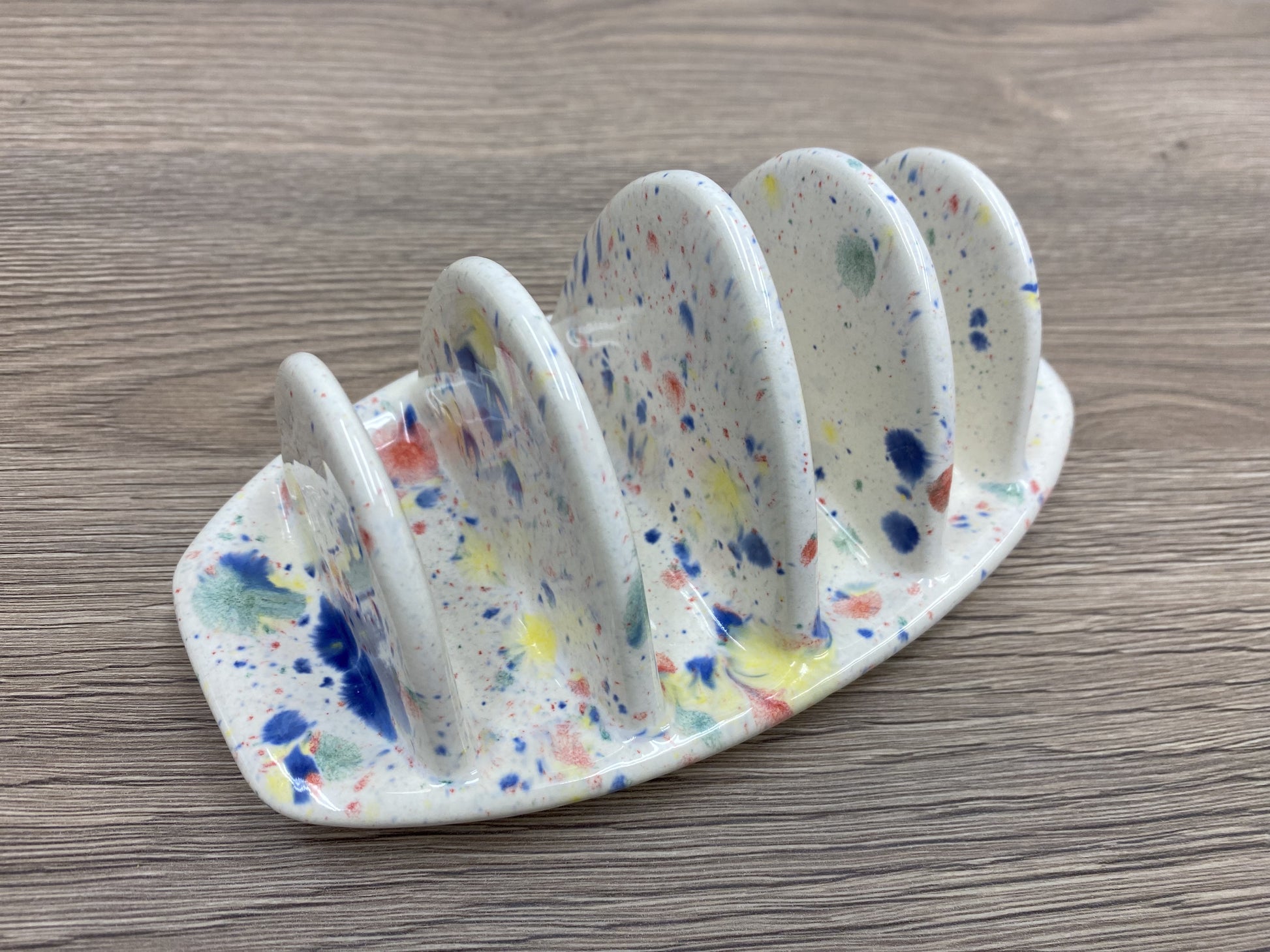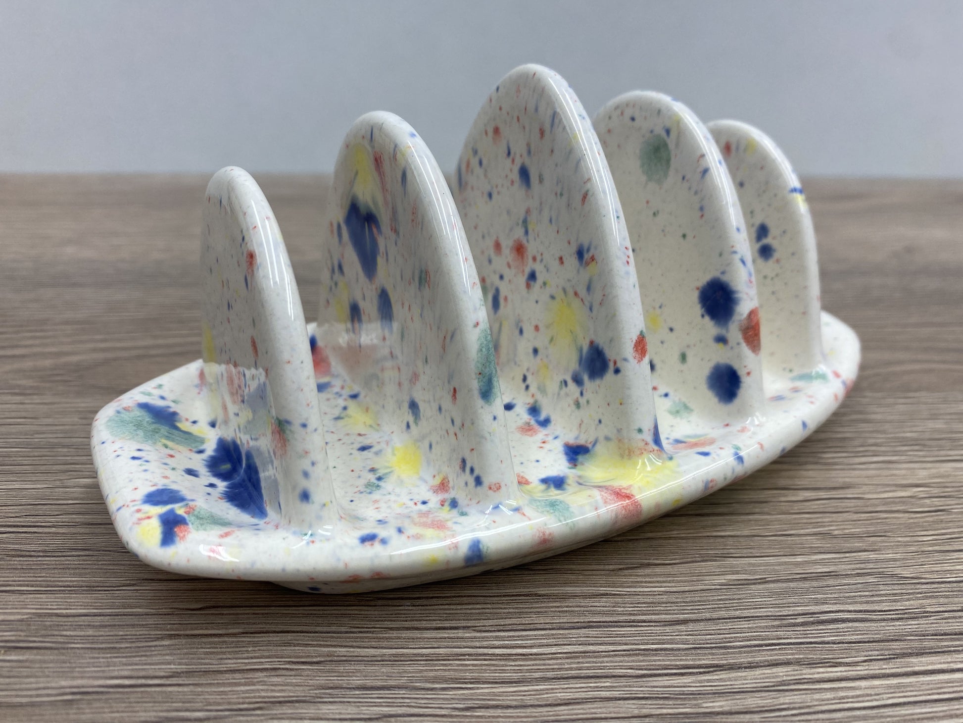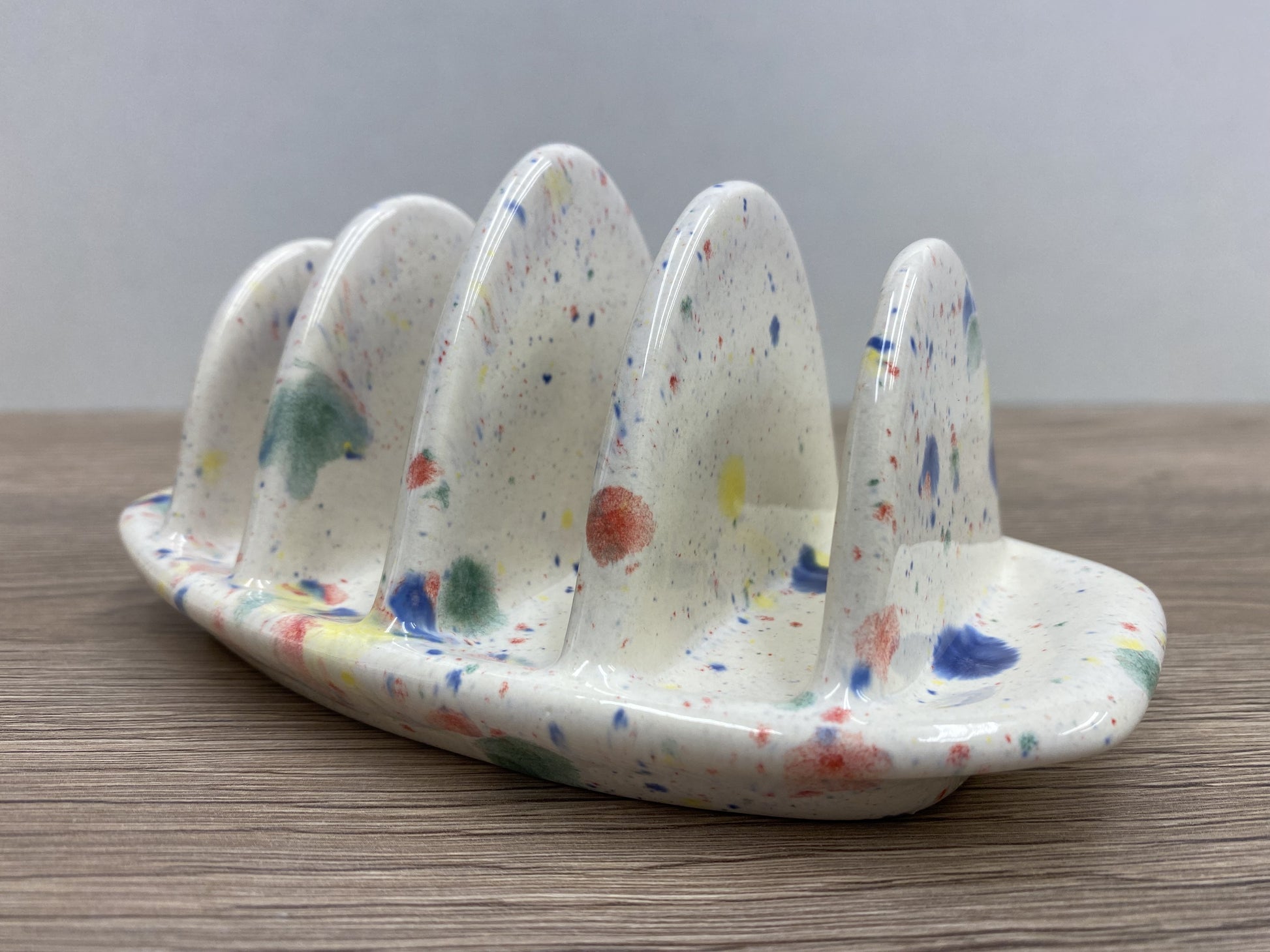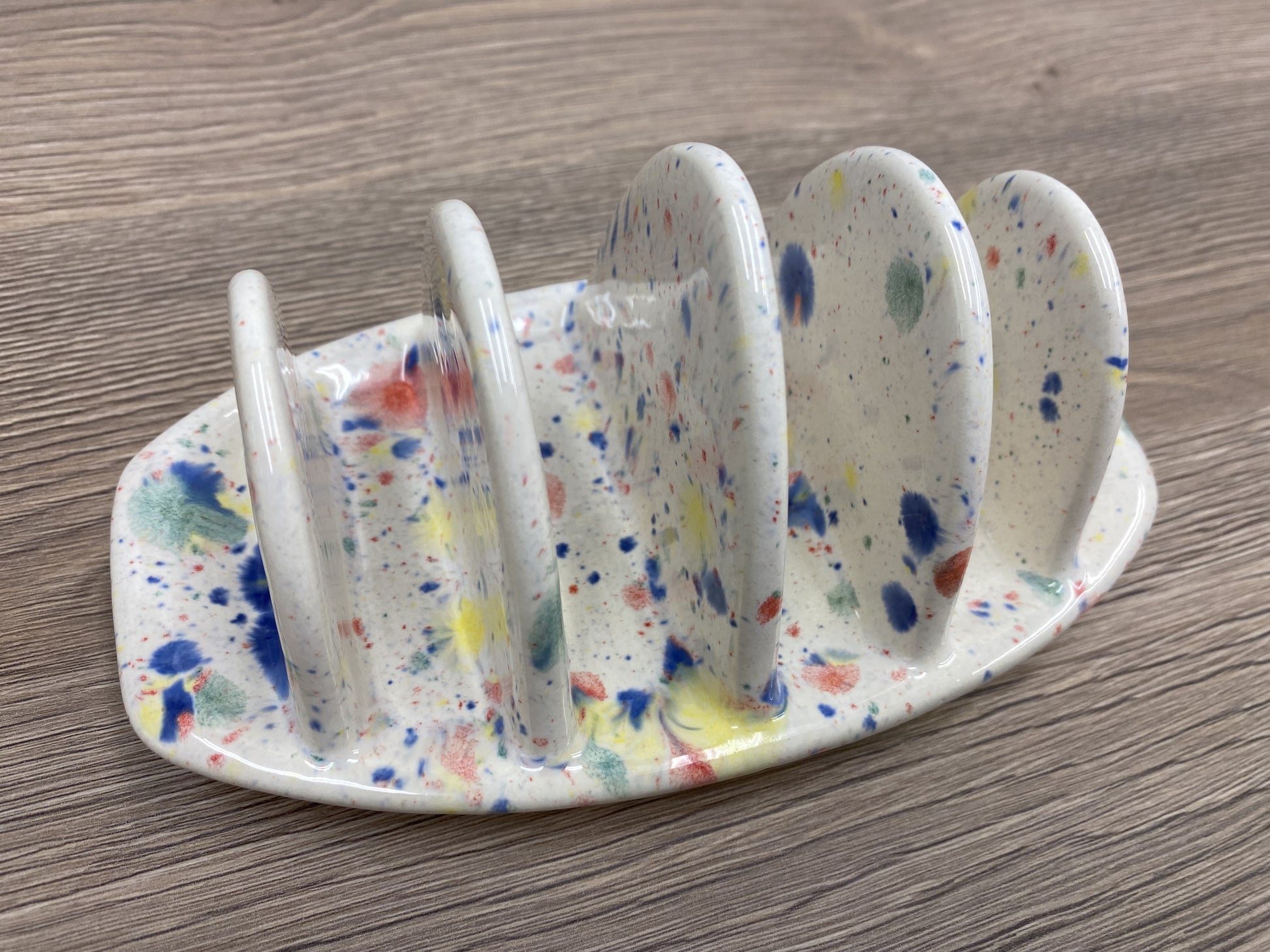 NEW Toast Rack design finished in a Brightly Coloured Glaze to match our Butter Dish and Sugar Bowl for your breakfast table. The extra-wide slots allow for thicker slices of toast.